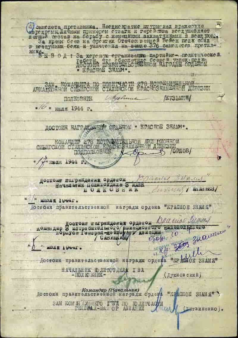 16.07.1944 заместитель командира по политчасти 43 иап майор представлен к награде и 10.09.1944 награждён вторым орденом Красного Знамени.