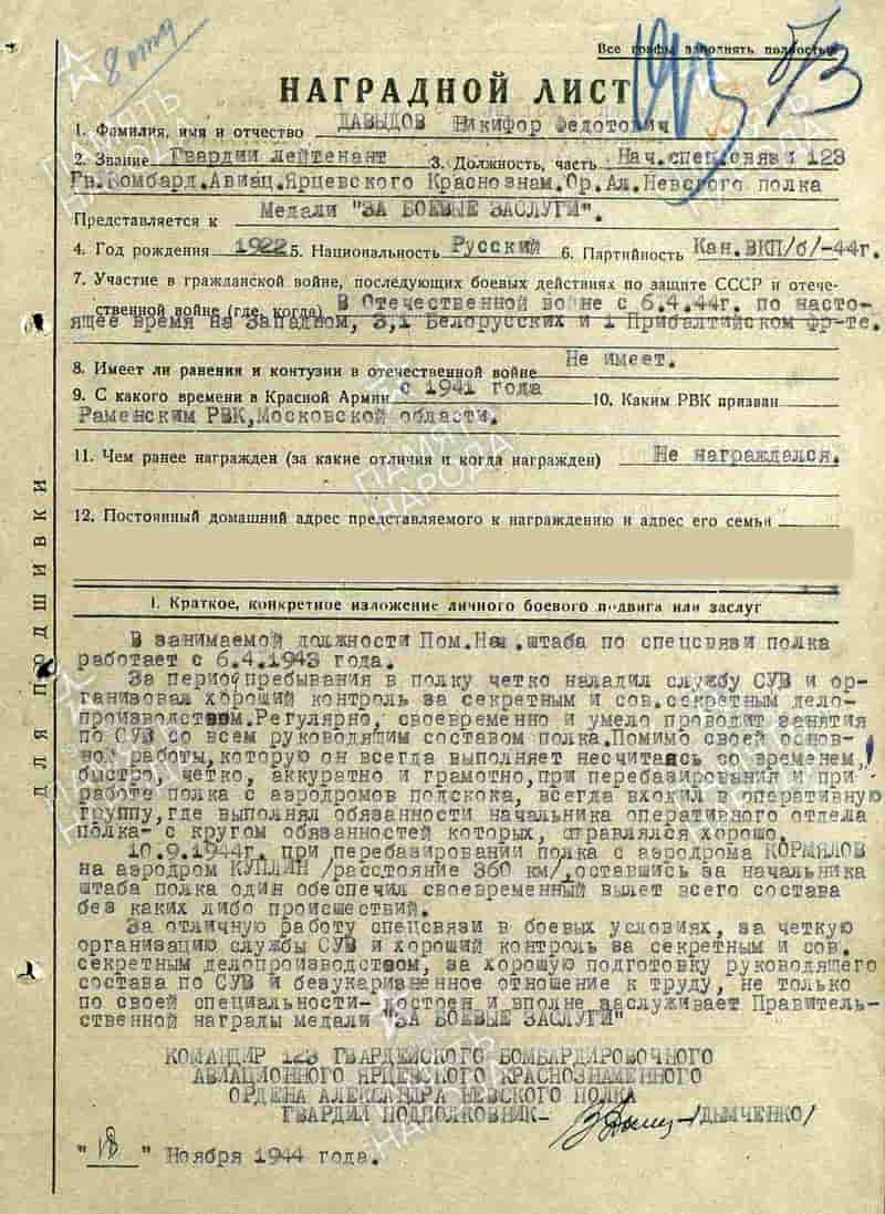 15.01.1945 начальник спецсвязи 123 гвардейского бап гвардии лейтенант Давыдов Н.Ф. представлен к награде.