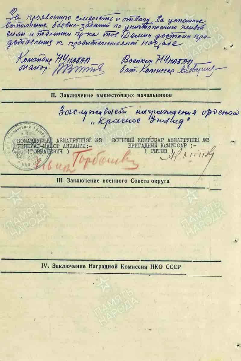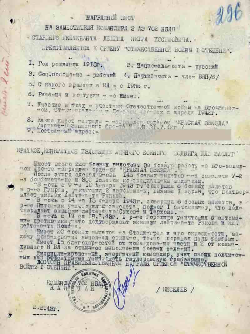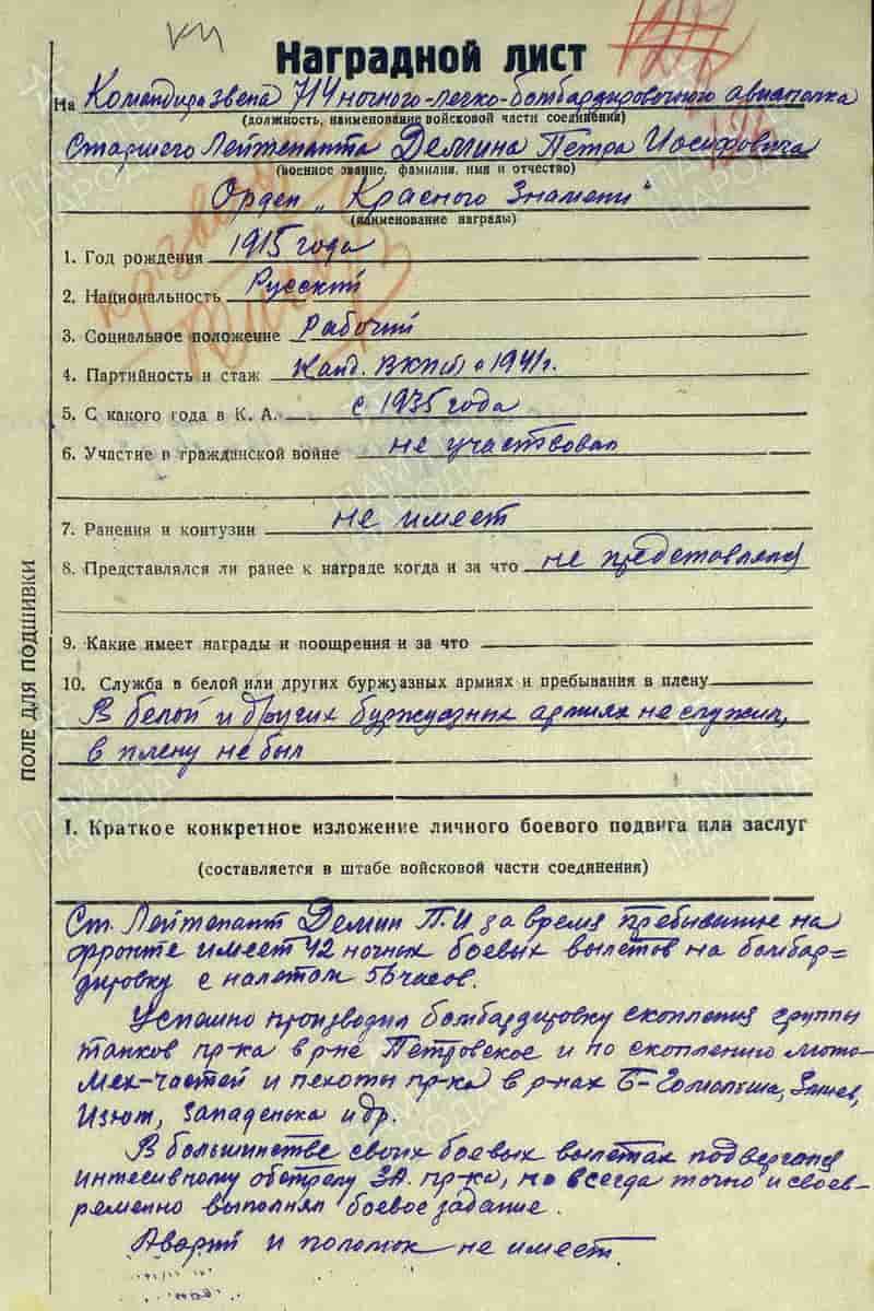 02.02.1943 заместитель командира 3-й эскадрильи 702 нбап старший лейтенант Дёмин П.И. представлен к награде и 16.02.1943 награждён орденом Отечественной войны I степени.