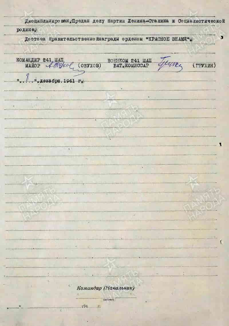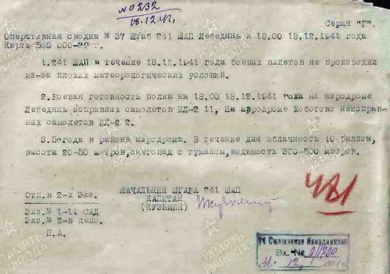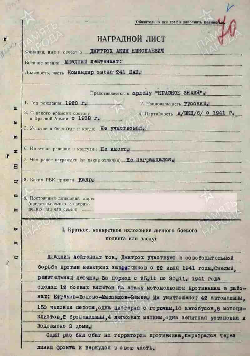 08.12.1941 командир звена 241 шап младший лейтенант Дмитрох А.Н. представлен к награждению орденом Красного Знамени.