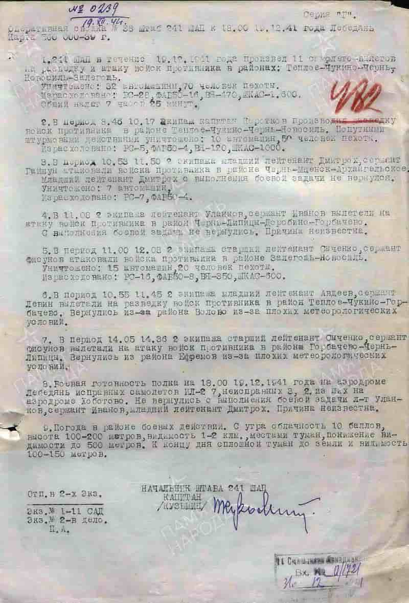 Командир звена 241 шап 11-й сад ВВС 3-й армии Брянского фронта младший лейтенант Дмитрох Аким Николаевич погиб 19.12.1941 (по другим данным 18.12.1941) - на самолёте Ил-2 не вернулся с боевого задания по штурмовке войск противника в районе Чернь - Мценск - Архангельское, пропал без вести.