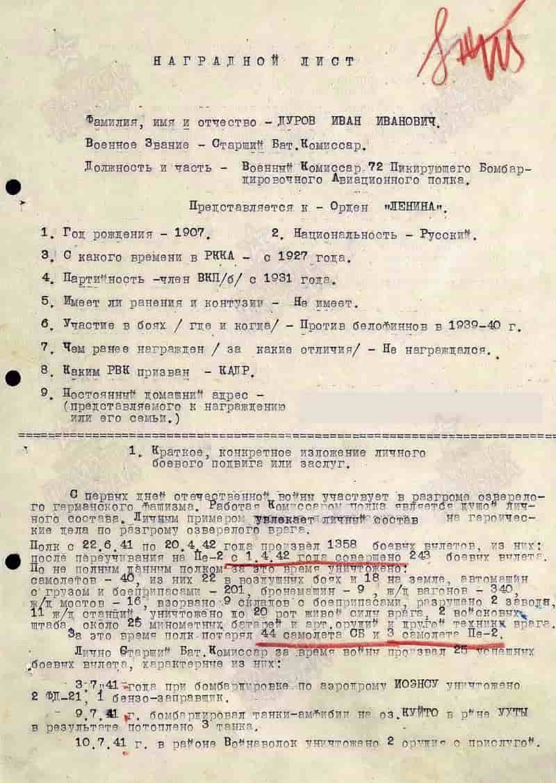 21.05.1942 военный комиссар 72 пикирующего бомбардировочного авиационного полка 6-й ударной авиационной группы Ставки ВГК старший батальонный комиссар Дуров И.И. представлен к награждению орденом Ленина. 12.07.1942 награждён орденом Красного Знамени.