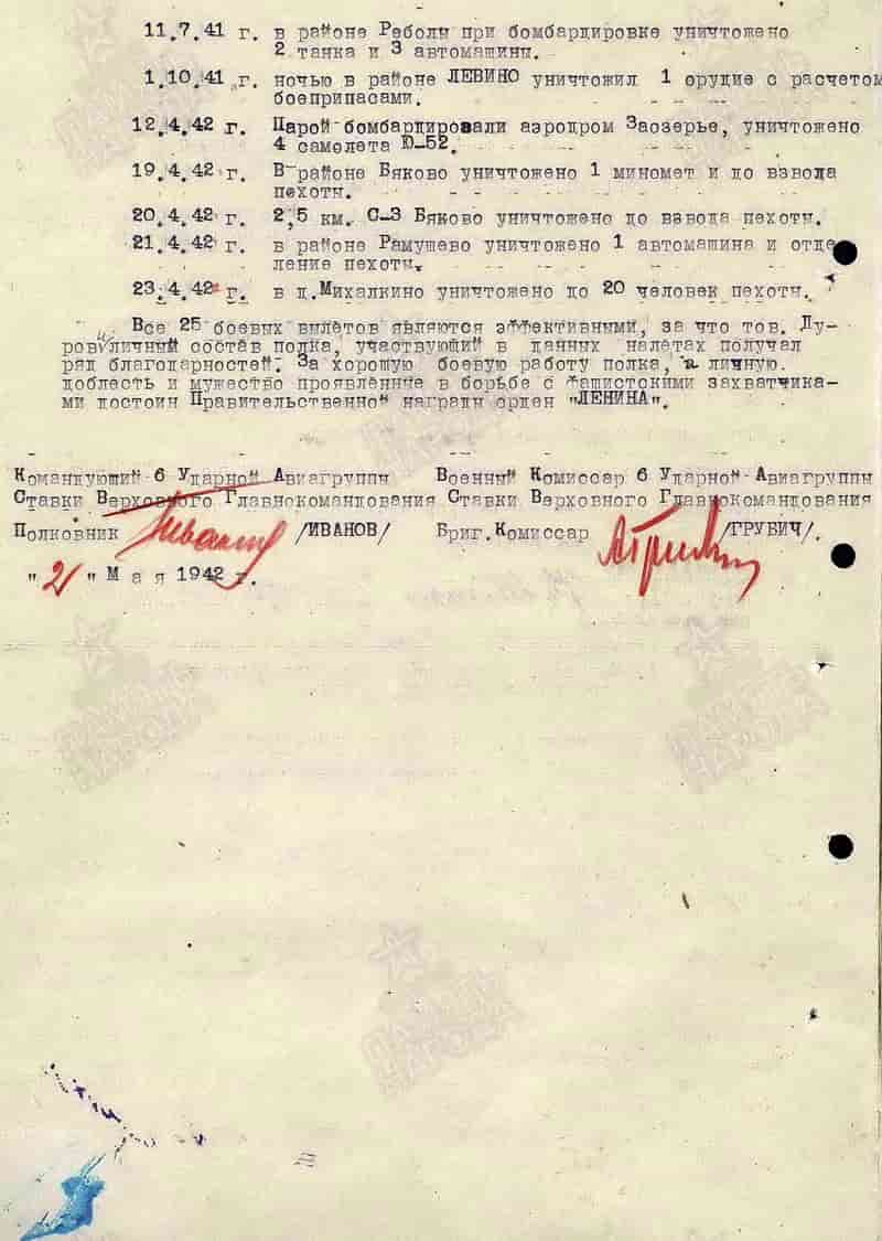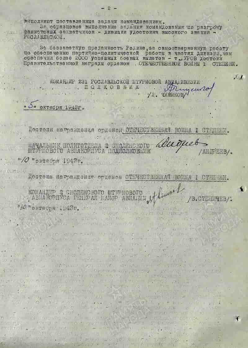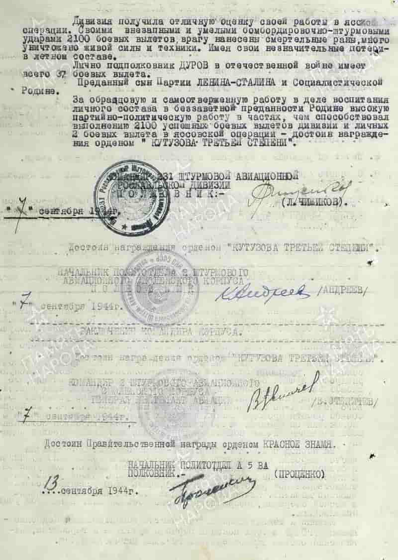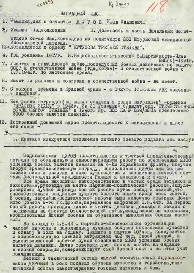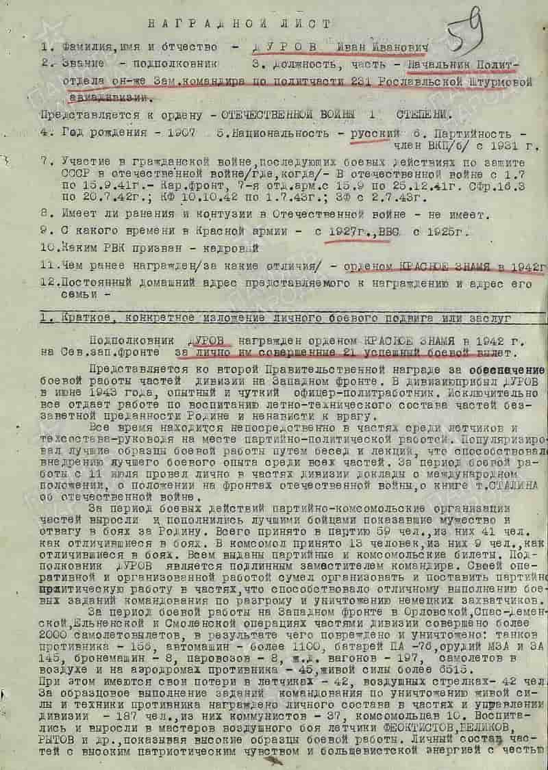 05.10.1943 начальник политотдела, заместитель командира 231 шад 1-й ВА Западного фронта по политчасти подполковник Дуров Иван Иванович представлен к награде и 13.10.1943 награждён орденом Отечественной войны I степени.