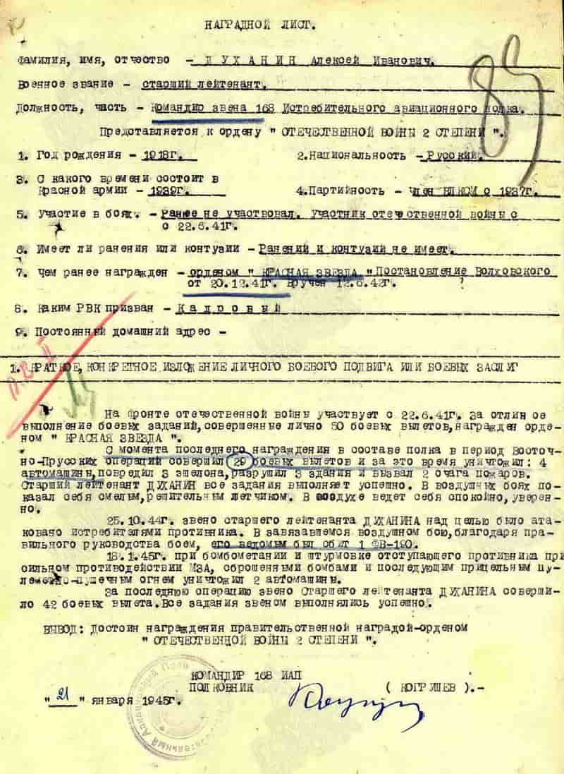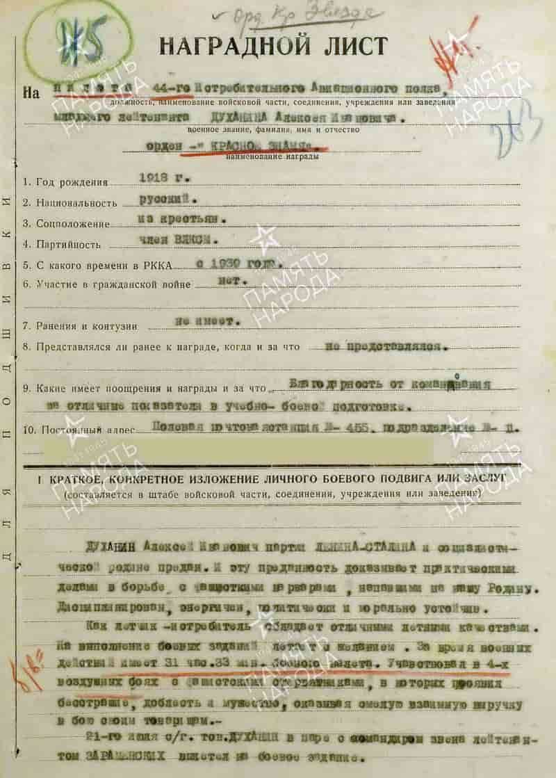 03.08.1941 пилот 44 иап ПВО 7-го иак ПВО Северного фронта младший лейтенант Духанин А.И. представлен к награждению орденом Красного Знамени. 20.12.1941 награждён орденом Красной Звезды.