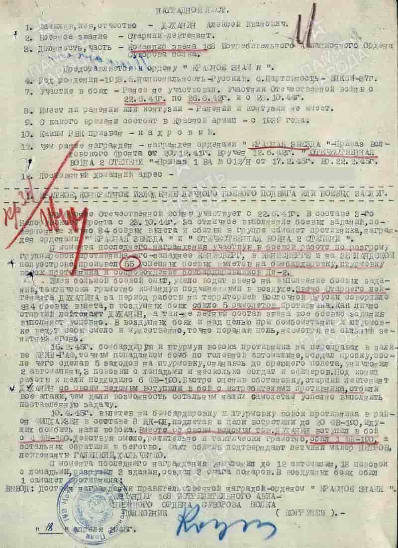 18.04.1945 командир звена 168 иап 130 иад 1 ВА 3-го Белорусского фронта старший лейтенант представлен к награде и 29.04.1945 награждён орденом Красного Знамени.