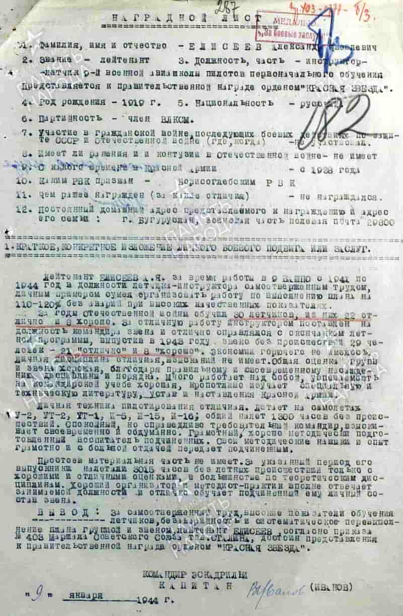 09.01.1944 инструктор-лётчик 9-й ВАШПО лейтенант Елисеев А.Я. представлен к награждению орденом Красной Звезды. 02.08.1944 награждён медалью «За боевые заслуги».