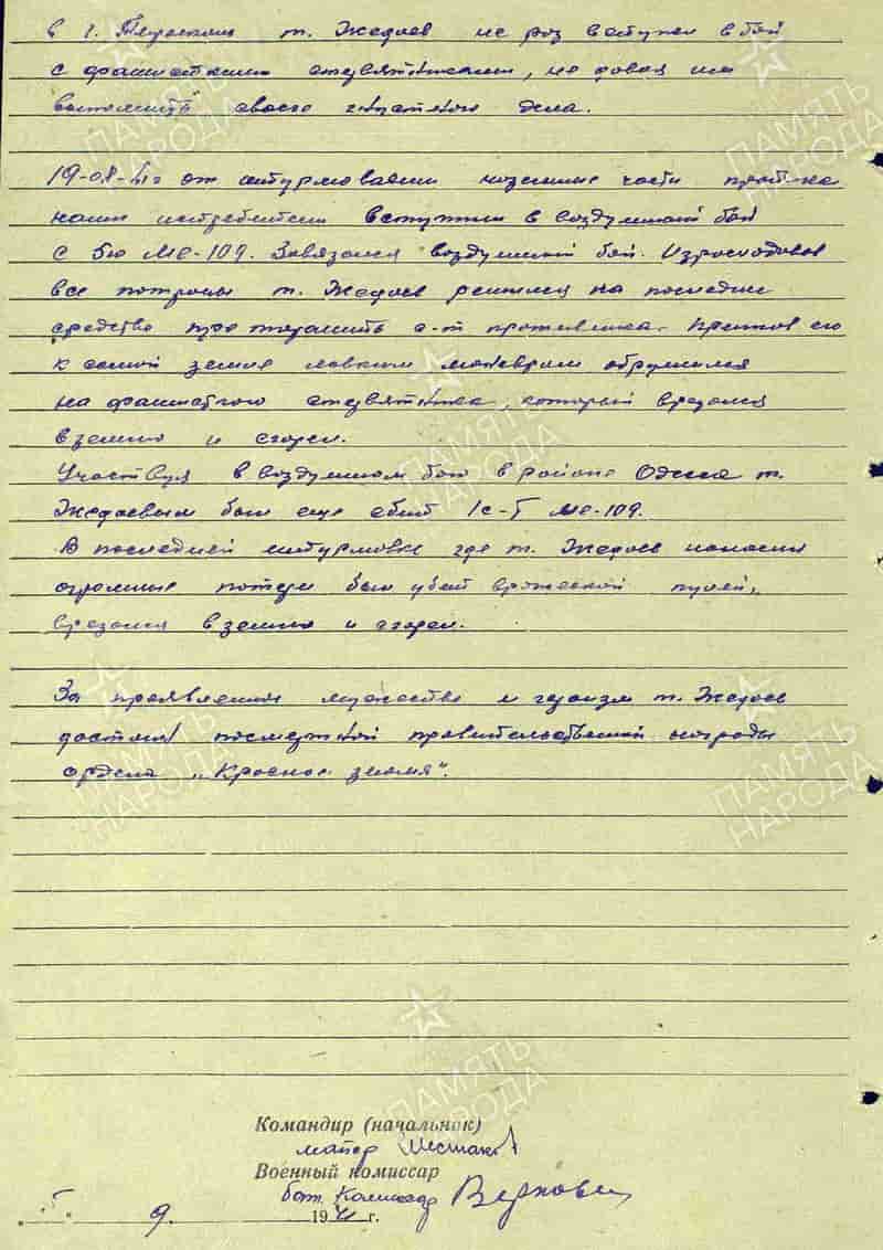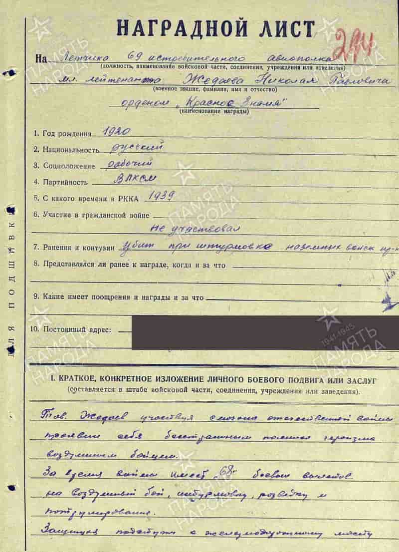 05.09.1941 лётчик 69 иап младший лейтенант Жедаев Н.П. посмертно представлен к награждению орденом Красного Знамени.