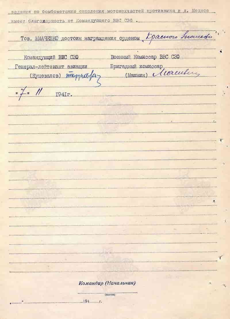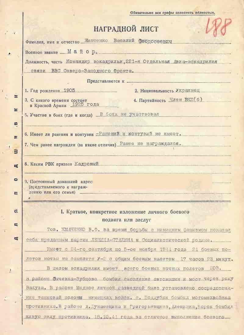 07.11.1941 командир 221 отдельной авиационной эскадрильи связи ВВС Северо-Западного фронта майор Жмаченко В.Ф. представлен к награде и 27.11.1941 награждён орденом Красного Знамени.
