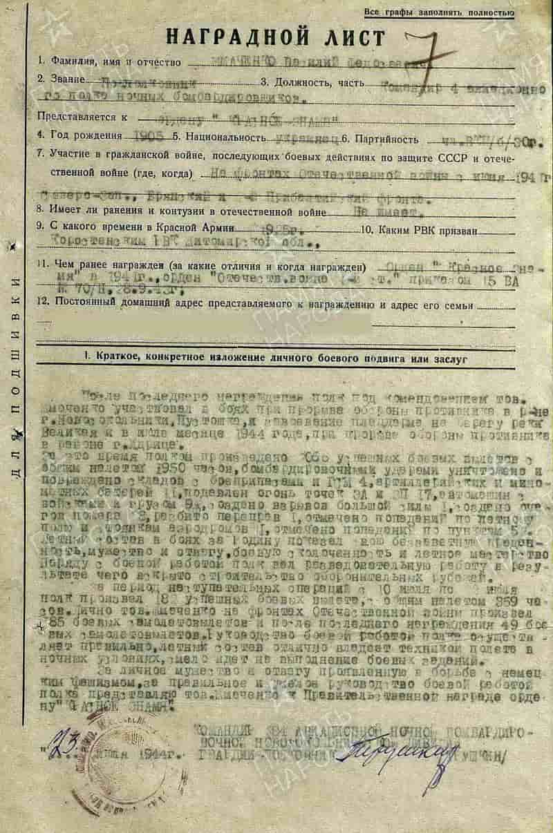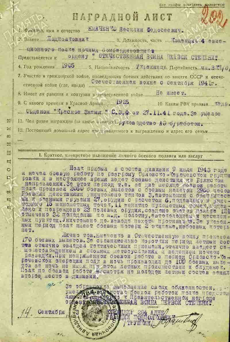 14.09.1943 командир 4 нбап 313 нбад 15-й ВА Брянского фронта подполковник Жмаченко В.Ф. представлен к награде и 28.09.1943 награждён орденом Отечественной войны I степени.