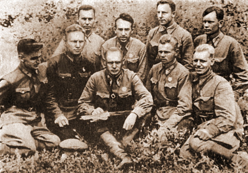 Первый ряд (слева направо): А.Д. Журавлёв, Г.Е. Емельянов, А.Н. Немтинов, Т.К. Маслов, Г.П. Коваленко. Второй ряд: М.В. Пронин, С.А. Фомин, П.С. Назаров, Н.А. Шиндяпин. Май. 1942 г.