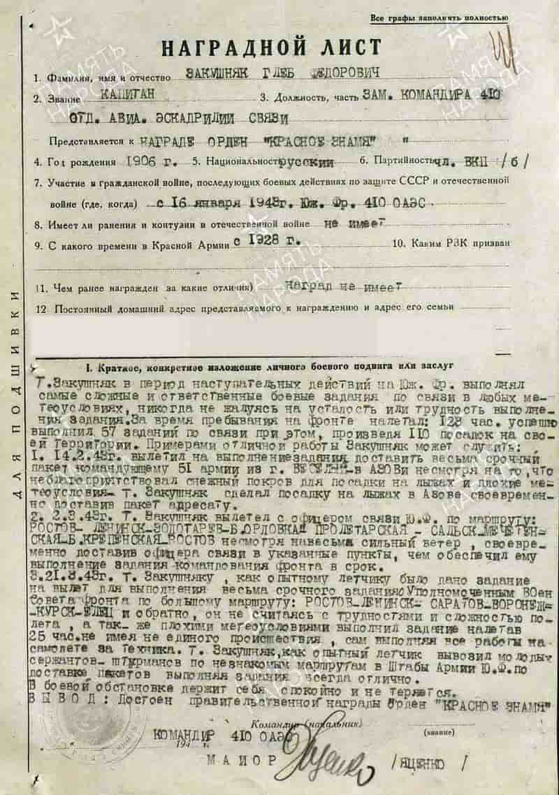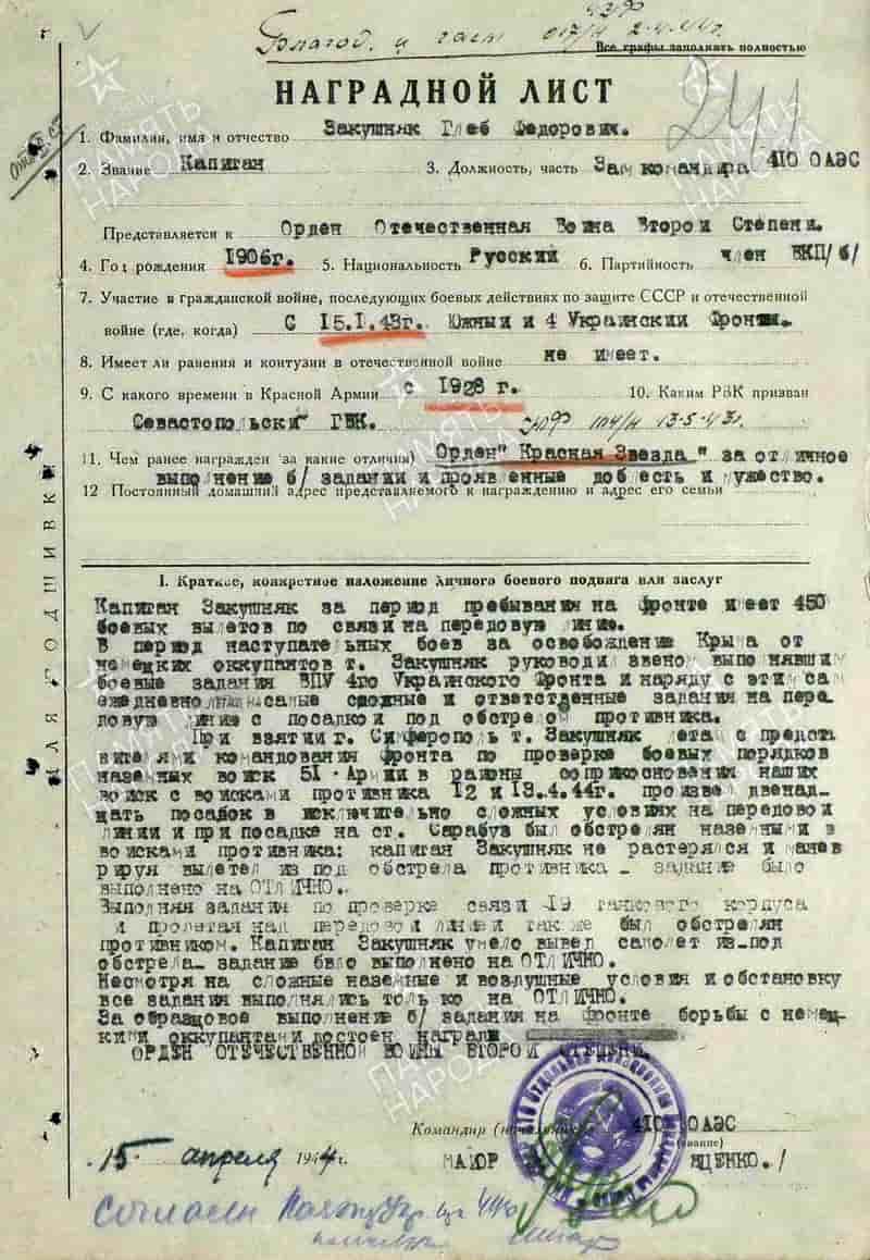 15.04.1944 заместитель командира 410 оаэс 8-й ВА 4-го Украинского фронта капитан Закушняк Г.Ф. представлен к награде и 27.04.1944 награждён орденом Отечественной войны II степени.
