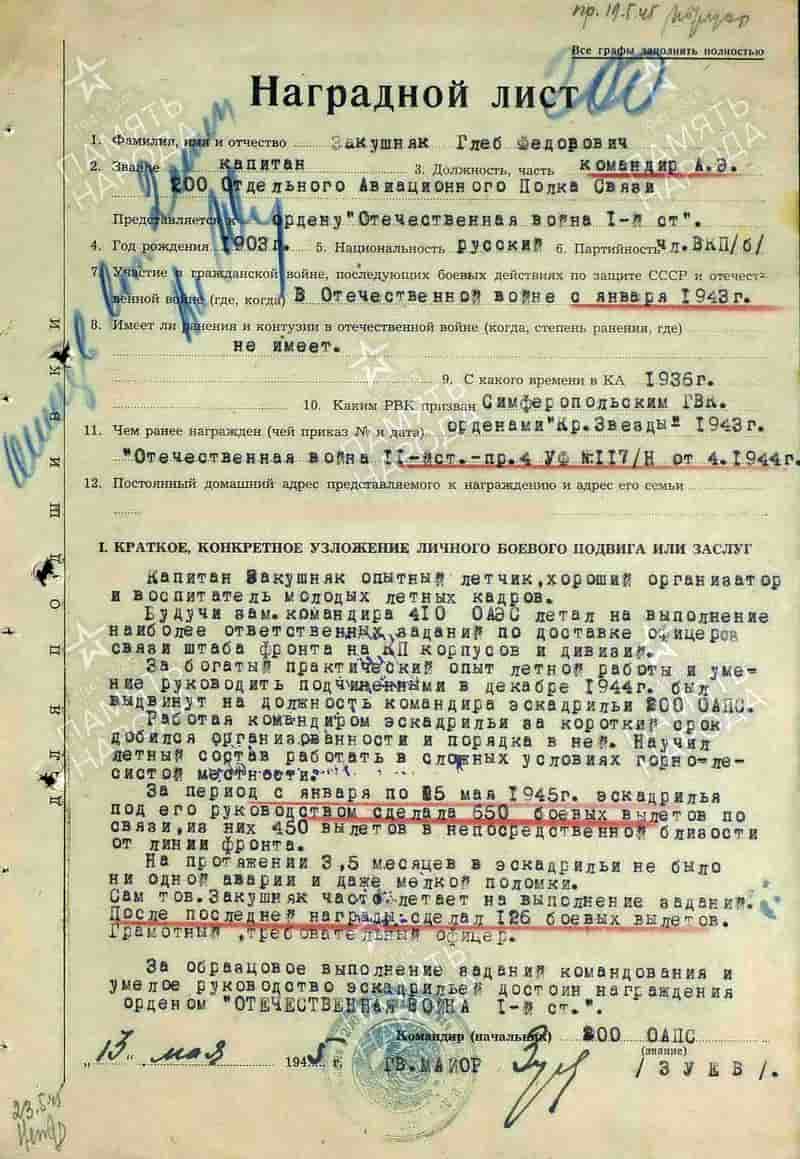 13.05.1945 командир эскадрильи 200-го отдельного авиационного полка связи 8-й ВА капитан Закушняк Г.Ф. представлен к награждению орденом Отечественной войны I степени. 03.06.1945 награждён орденом Отечественной войны II степени.