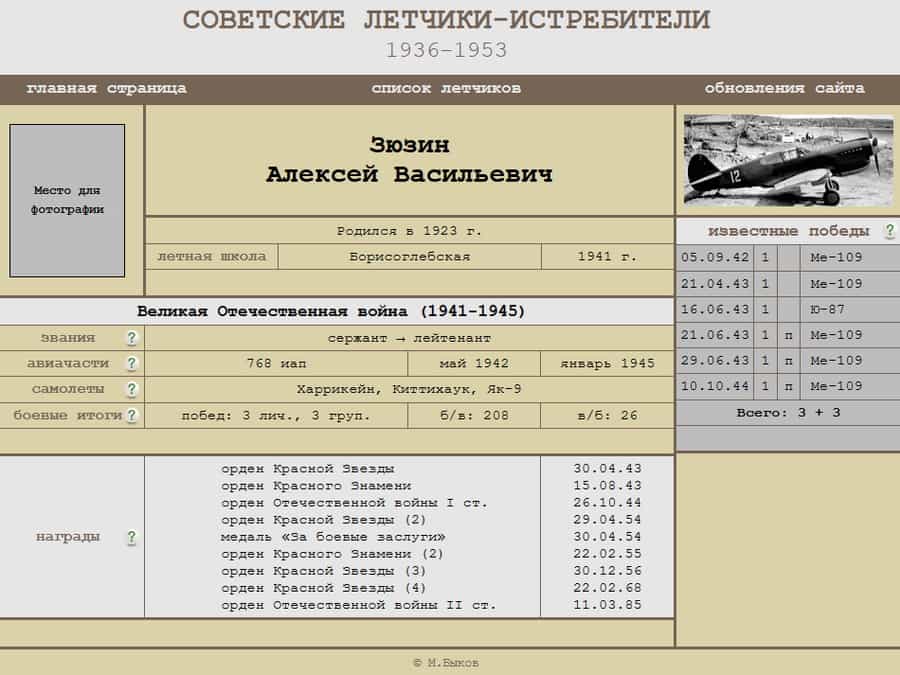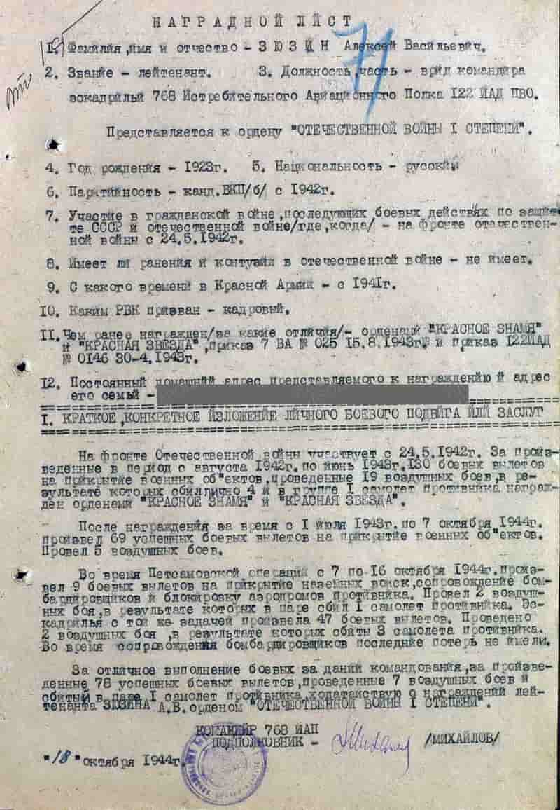 18.10.1944 врид командира эскадрильи 768 иап 1-го Корпуса ПВО Северного фронта ПВО лейтенант Зюзин А.В. представлен к награде и 26.10.1944 награжден орденом Отечественной войны I степени.