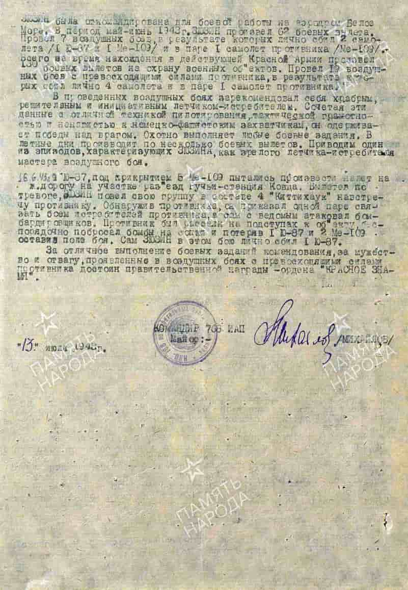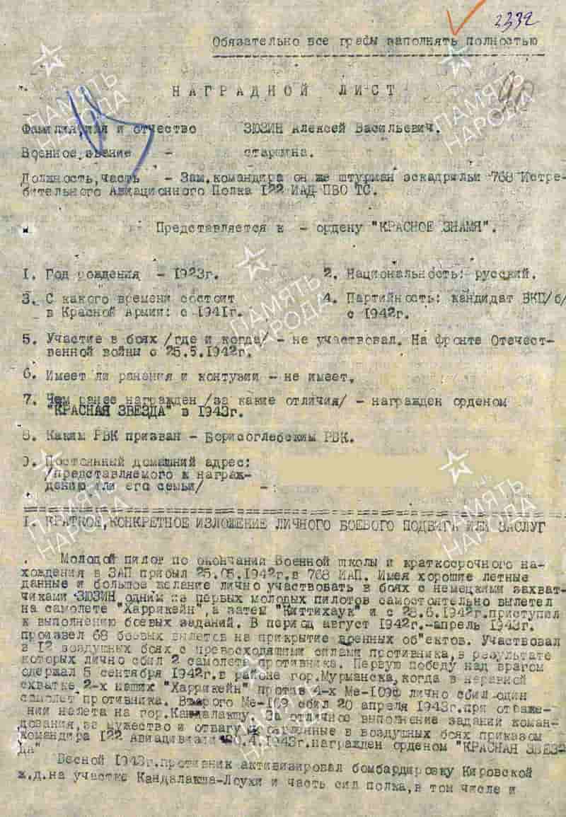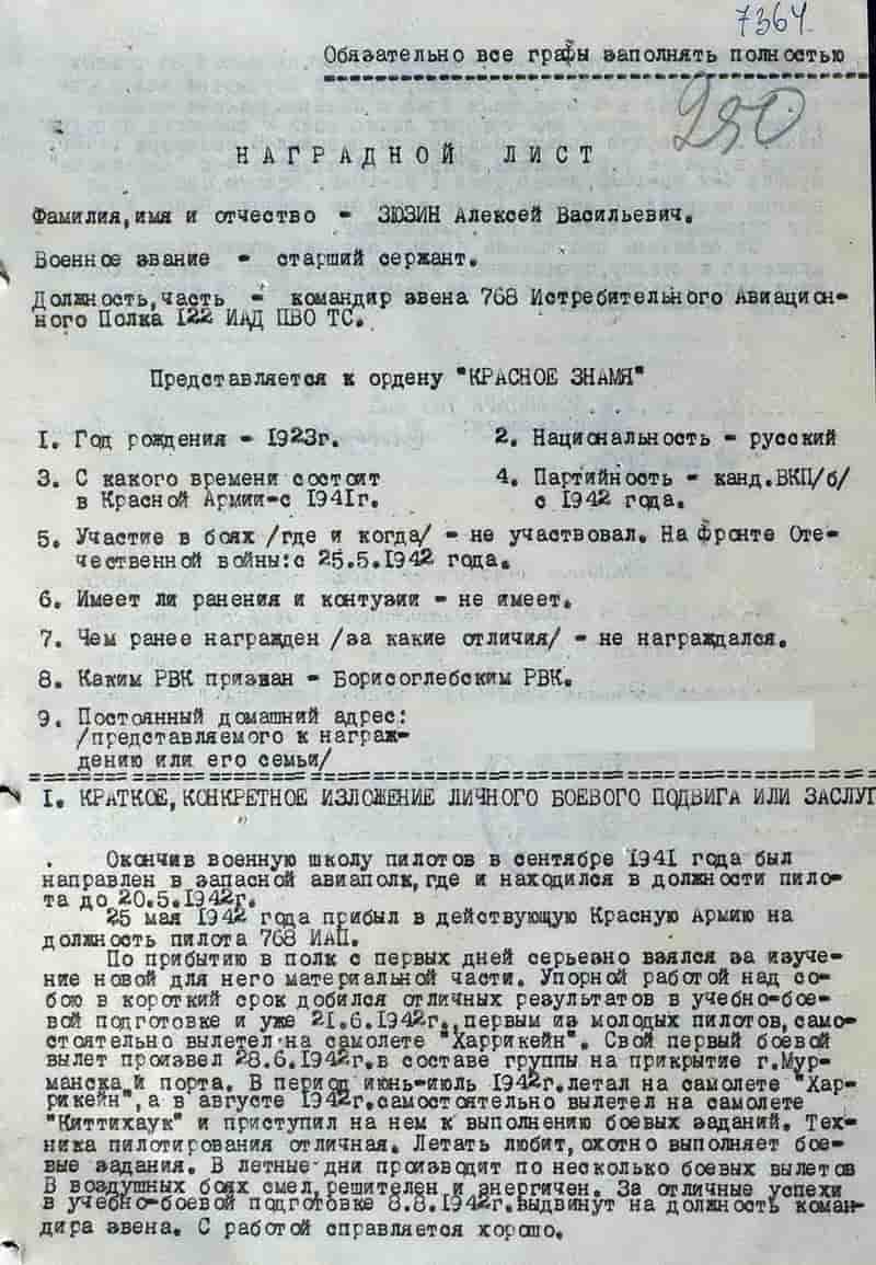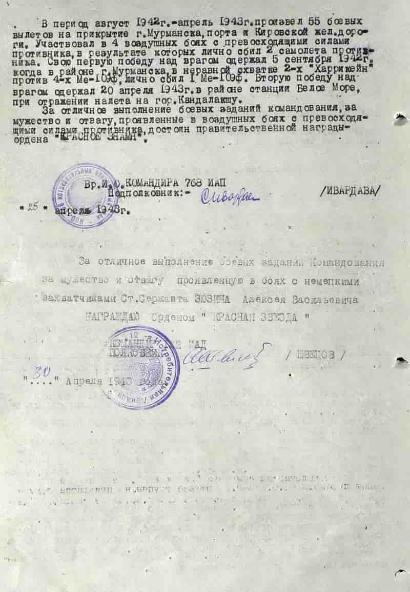 13.07.1943 заместитель командира, штурман эскадрильи 768 иап ПВО 122 иад ПВО Западного фронта ПВО старшина Зюзин А.В. представлен к награде и 15.08.1943 награждён орденом Красного Знамени.