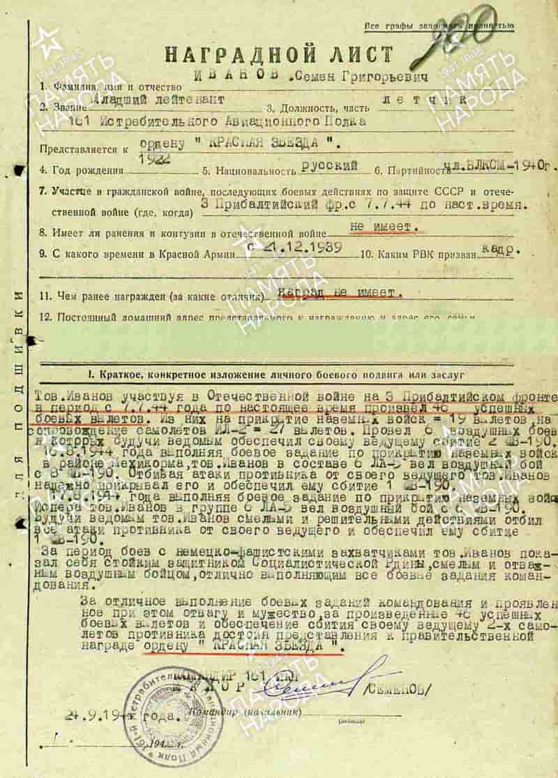 24.09.1944 лётчик 161 иап младший лейтенант Иванов С.Г. представлен к награде и 05.10.1944 награждён орденом Красной Звезды.
