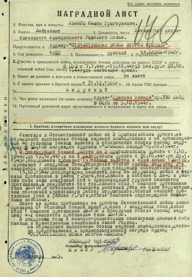 26.01.1945 лётчик 161 иап 330 иад 1-й ВА 3-го Белорусского фронта лейтенант Иванов С.Г. представлен к награде и 22.02.1945 награждён орденом Отечественной войны II степени.