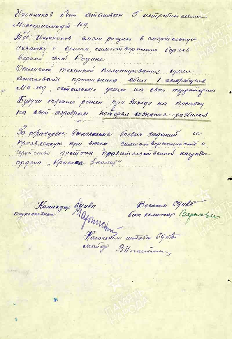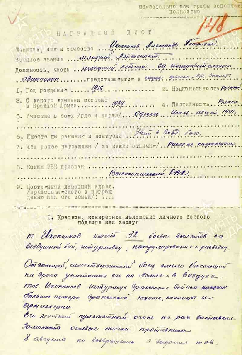 Также фамилия Иконникова А.П. есть в списке представленных к награждению медалью «За оборону Одессы» участников обороны г. Одессы в составе 69 иап (9 гиап), погибших в боях за Социалистическую Родину.