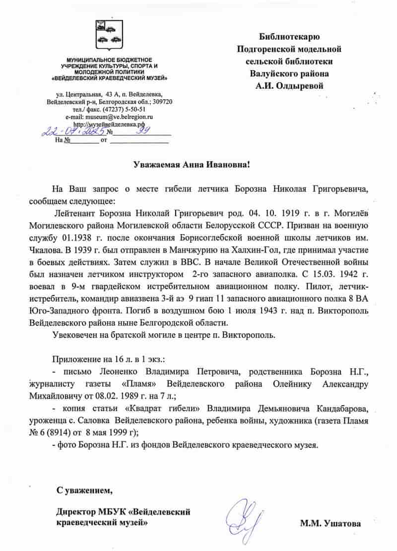 Ответ из Вейделевского краеведческого музея на запрос о судьбе Борозны Николая Григорьевича