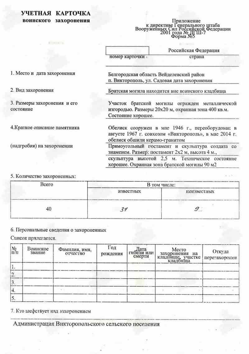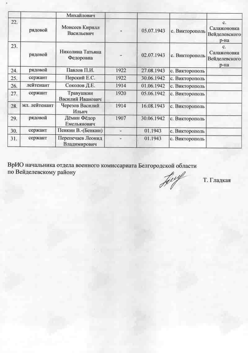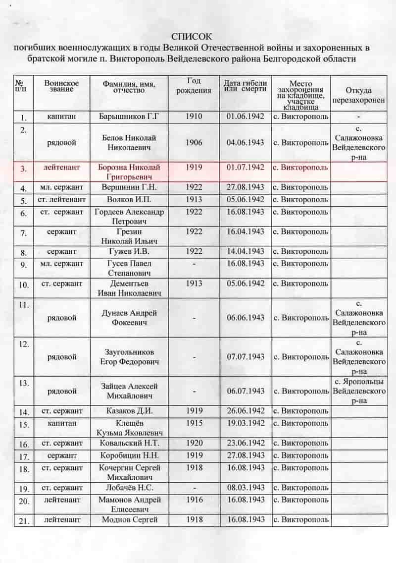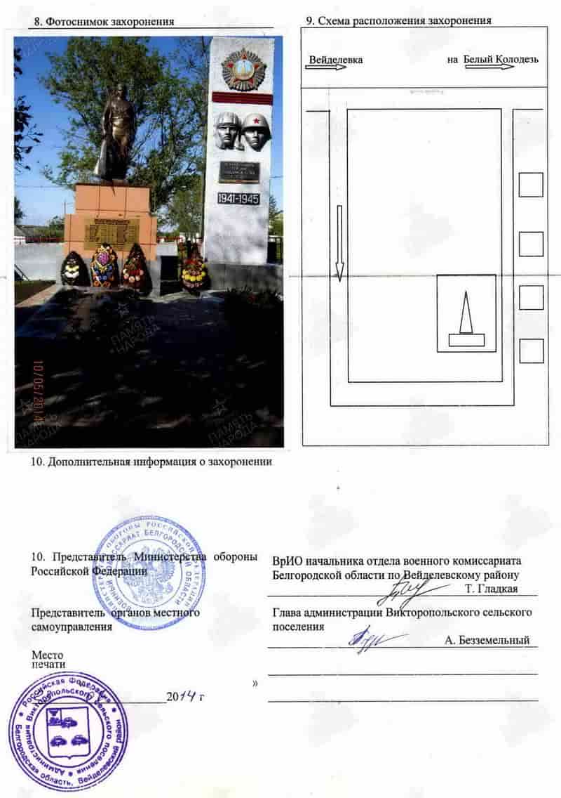 Кроме них в братской могиле захоронены жители поселка Викторополь бойцы истребительного отряда погибшие в бою с группой отступающих немецких солдат зимой 1943 года возле хутора Боготобин – Перепечаев Леонид и Пенкин Василий. В братской могиле также лежат солдаты погибшие в бою летом 1942 года в урочище «Гнилое» из перенесли сюда из братской могилы которая находилась на восточной окраине урочища «Гнилое». Но всех ли их перенесли из той могилы, а может их не переносили совсем точно установить не удалось. Возможно братскую могилу возле урочища «Гнилое» взяли да и запахали, ведь могила располагалась в 50 м. от урочища «Гнилое» в поле. Да и не все солдаты погибшие в том бою были захоронены в той братской могиле, многих из погибших просто прикопали на месте их гибели. Ведь по разным данным погибших было от 50 до 300 солдат. Твердохлебов П.И. не так давно указал место, на северной стороне урочища «Гнилое», где во рву лежат 6 погибших наших солдат. К сожалению пока не удалось установить не одной фамилии тех солдат которые погибли в урочище «Гнилое». Поиск продолжается.