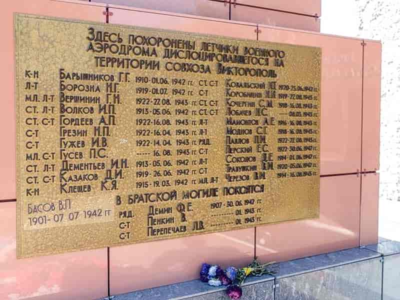Так случилось, что фамилии многих из них, до сих пор неизвестна. Были известны лишь 4 фамилии летчиков захороненных в братской могиле это летчики 9-го гиап: Герой Советского Союза капитан Елохин Агей Александрович 1912–23.06.1942, старший сержант Казаков Дмитрий Иванович 1919-26.06.1942, старший сержант Ковальский Николай Трофимович 1920-23.06.1942, лейтенант Борозна Николай Григорьевич 1919-01.07.1942.