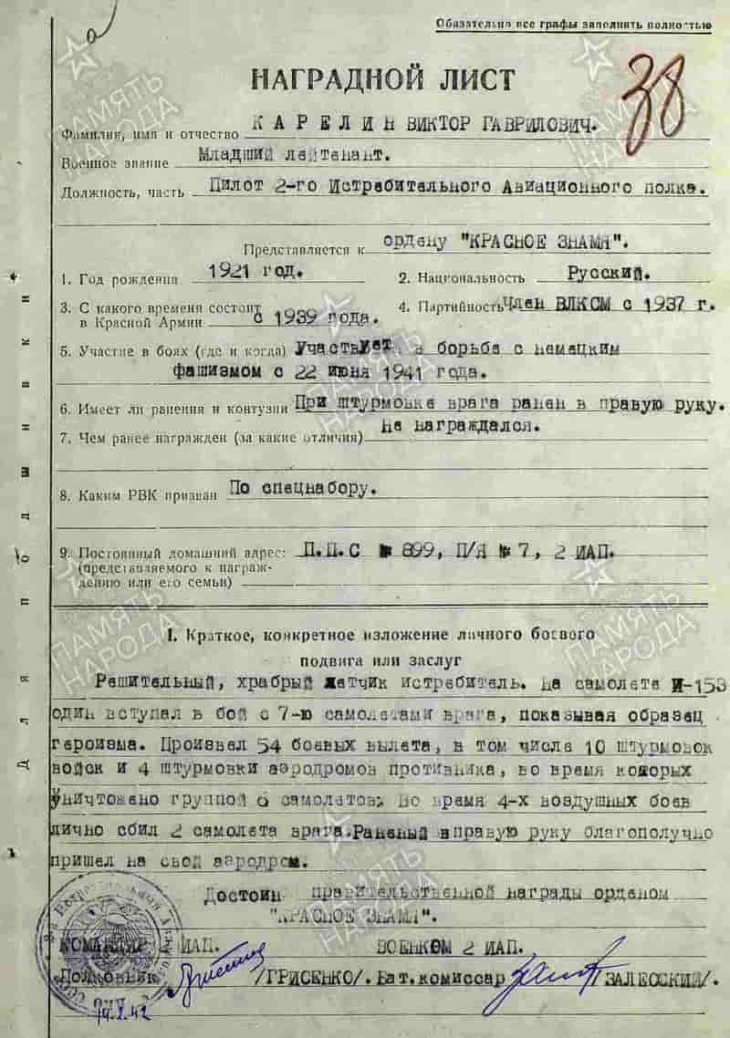 14.02.1942 пилот 2-го иап младший лейтенант Карелин В.Г. представлен к награде и 23.02.1942 награждён орденом Красного Знамени.