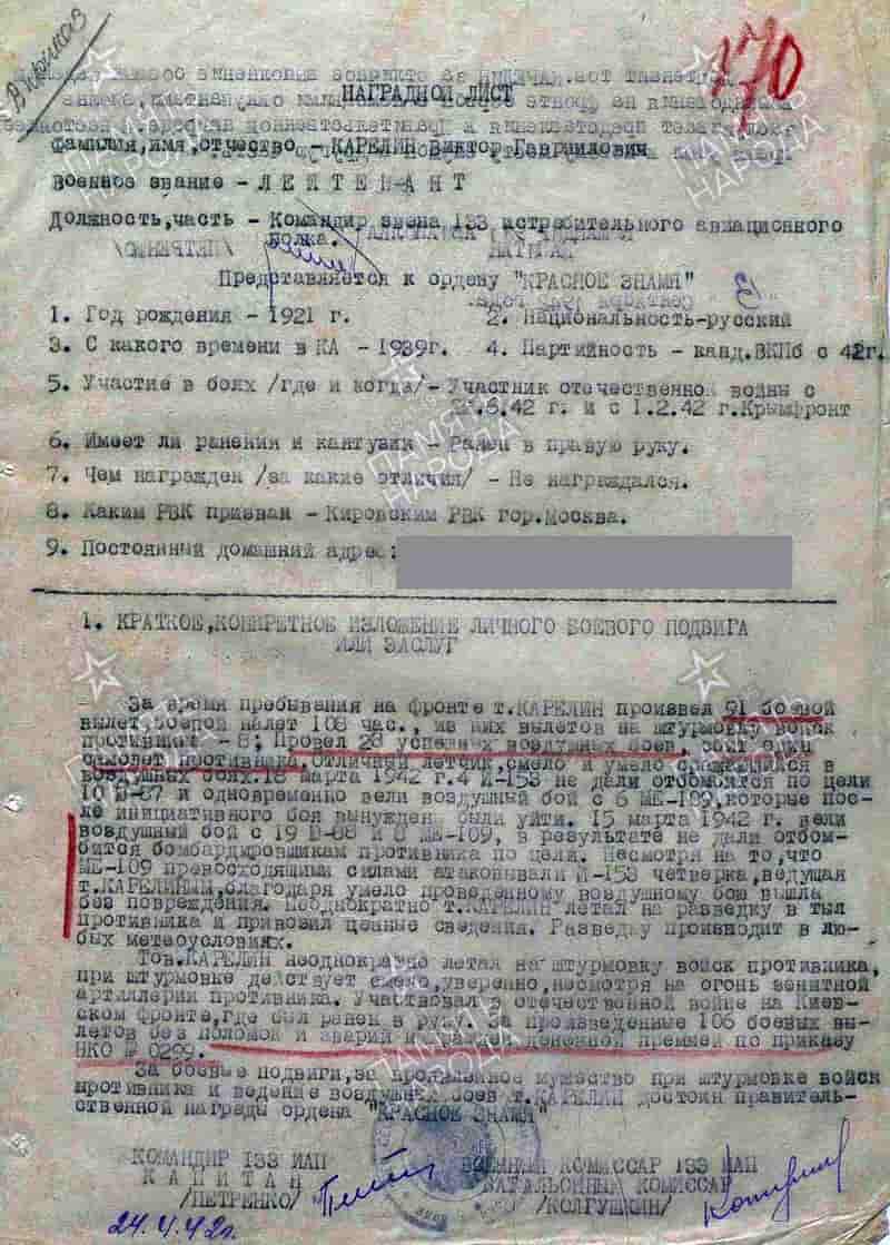 24.04.1942 командир звена 133 иап лейтенант Карелин В.Г. представлен к награде и 27.10.1942 награждён вторым орденом Красного Знамени.