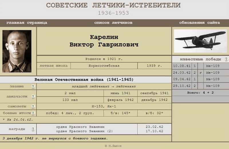Исключён из списков Красной армии приказом ГУФУ войск КА № 0130/пр. от 31.01.1943 как пропавший без вести 03.12.1942 заместитель командира эскадрильи 113 иап лейтенант Карелин В.Г.