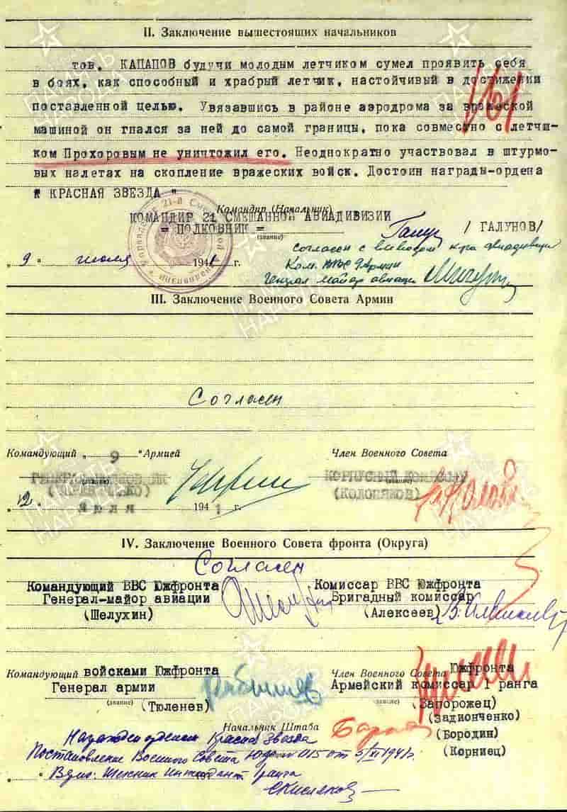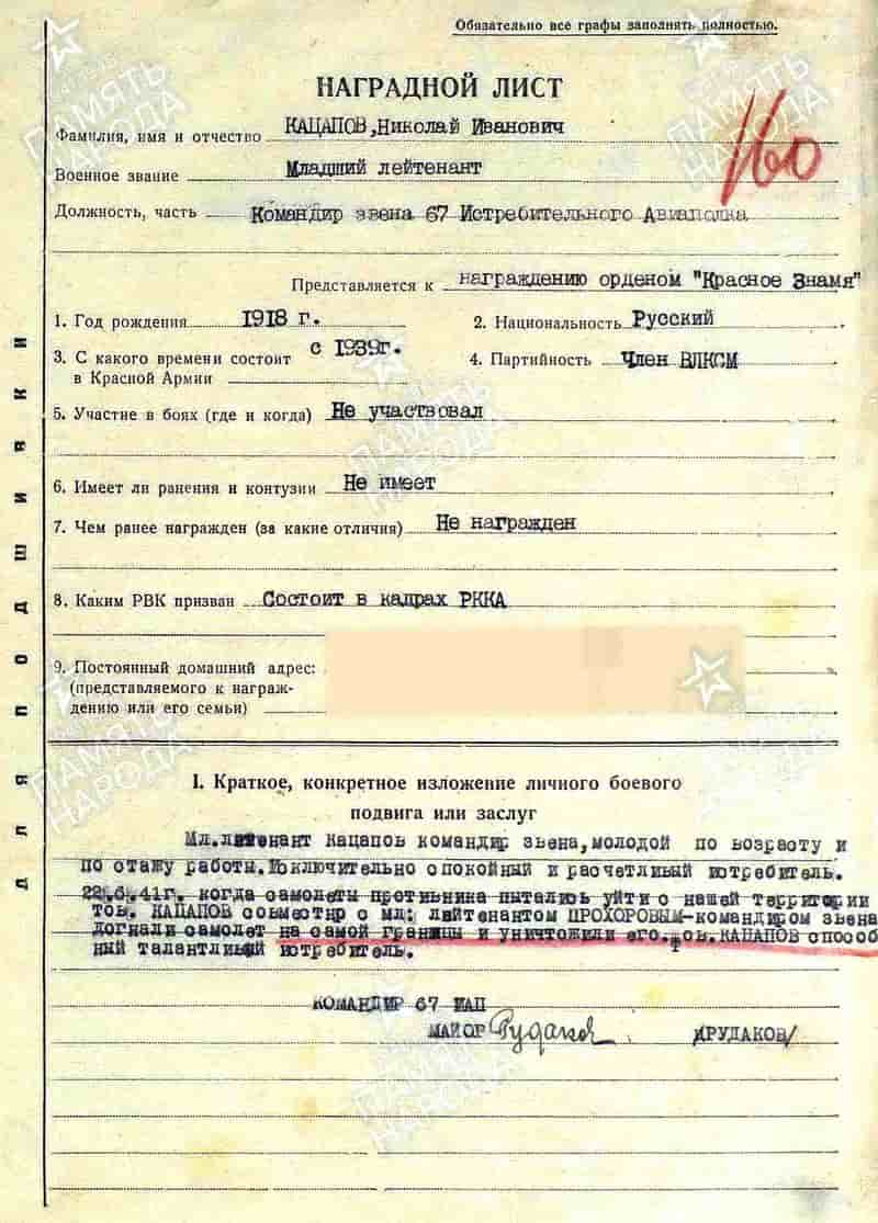 09.07.1941 командир звена 67-го иап младший лейтенант Кацапов Н.И. представлен к награде и 05.11.1941 награждён орденом Красной Звезды.