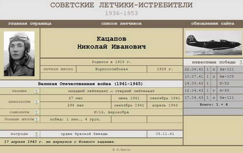 За время боевых действий старший лейтенант Кацапов Н.И. в воздушных боях в которых сбил лично 1 самолёт противника и 4 в составе группы (по данным Быкова М.Ю.).