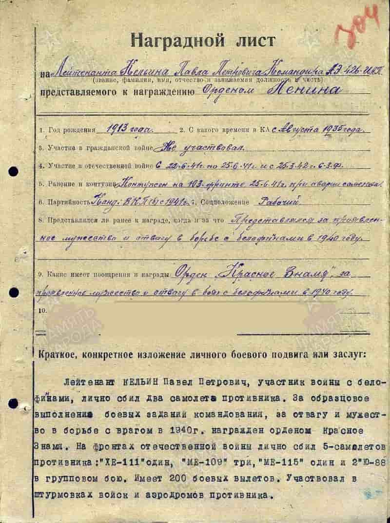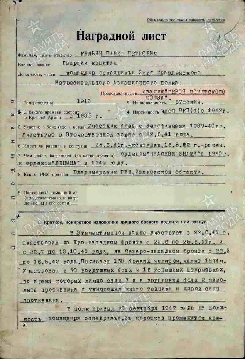 07.04.1940 Указом Президиума ВС СССР за образцовое выполнение боевых заданий командования на фронте борьбы с финской белогвардейщиной и проявленные при этом доблесть и мужество лейтенант Кельин П.П. награждён орденом Красного Знамени.