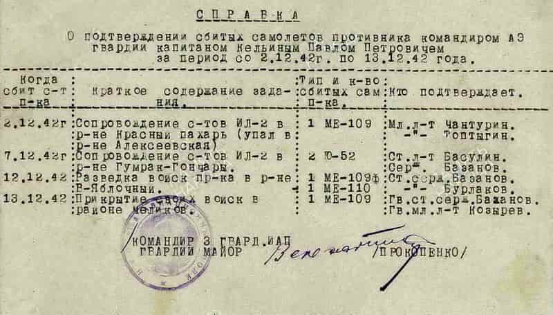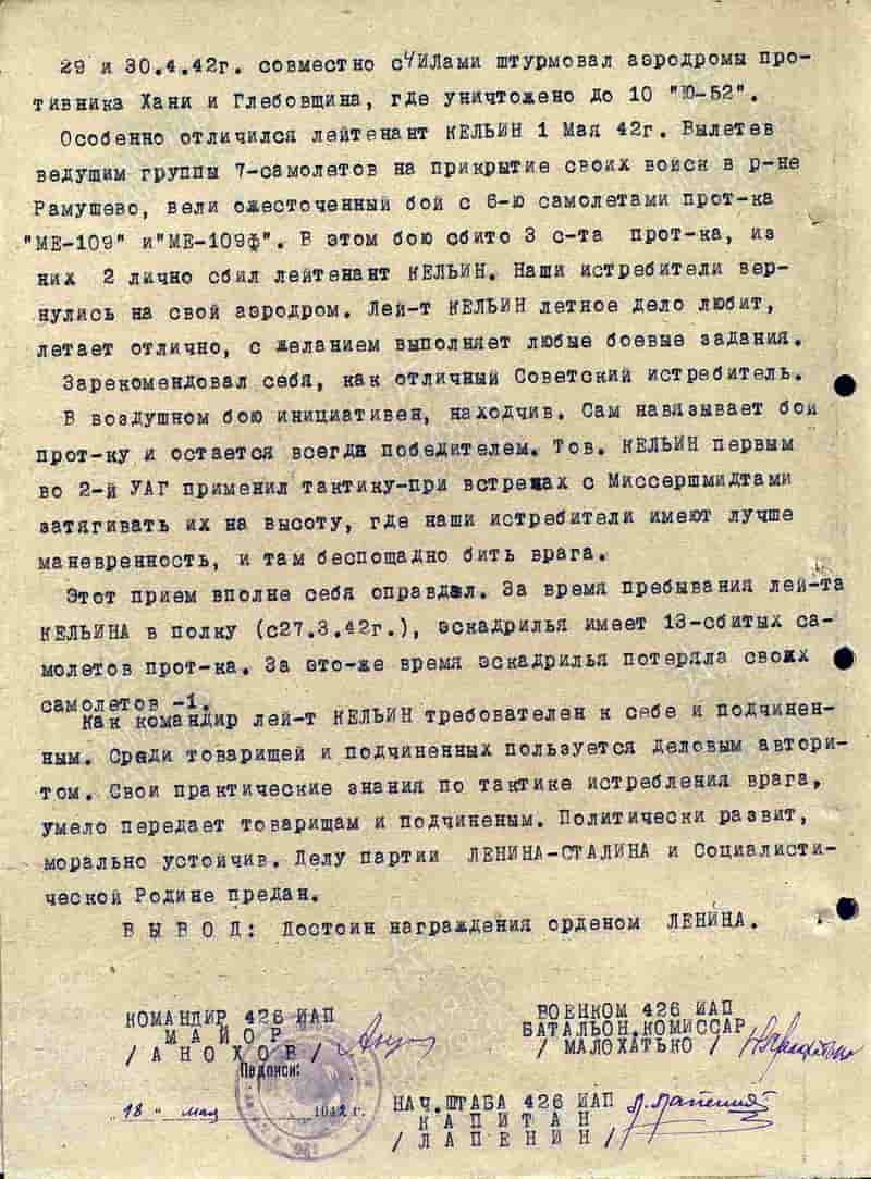 18.05.1942 командир эскадрильи 426 иап лейтенант Кельин П.П. представлен к награде и 23.06.1942 награждён орденом Ленина.