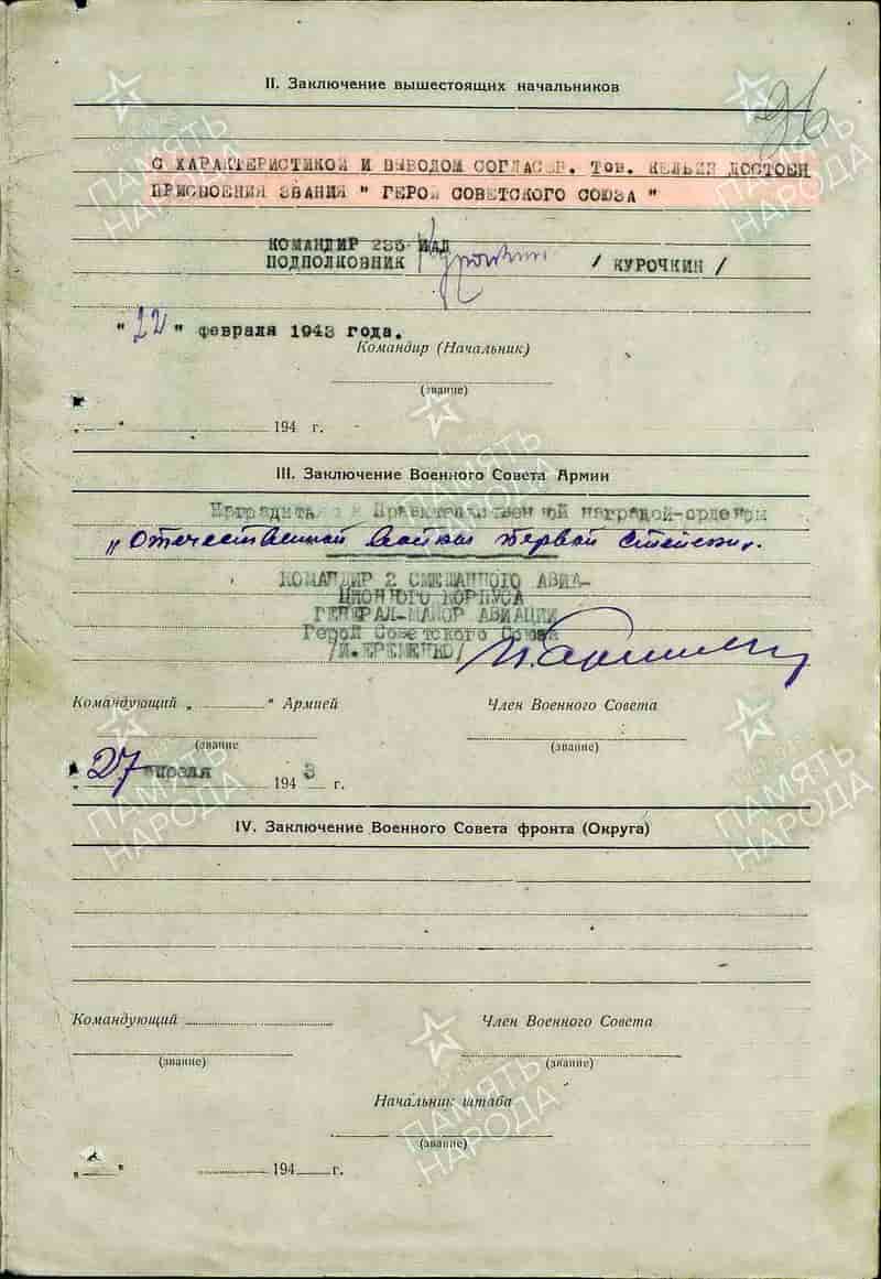 28.02.1943 назначен и.д. штурмана 3 гвардейского иап, командиром эскадрильи 3 гвардейского иап.