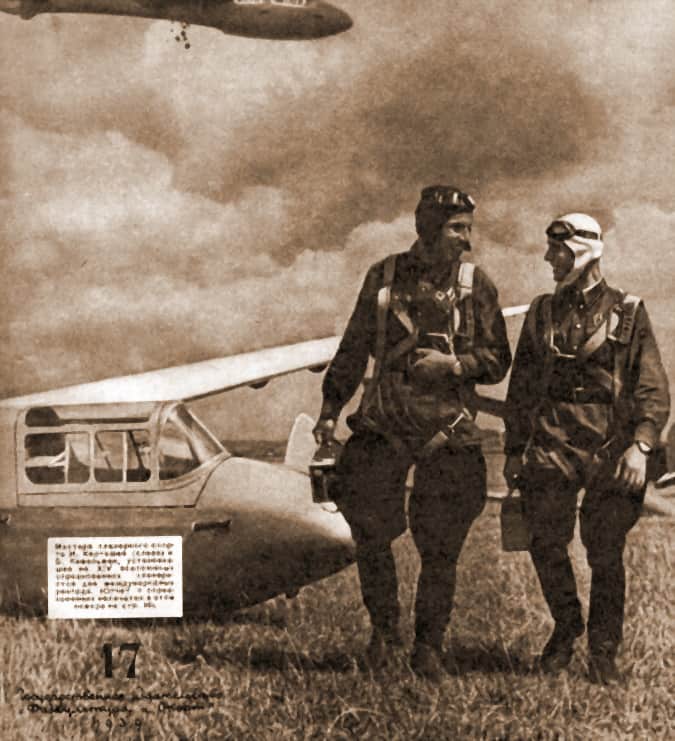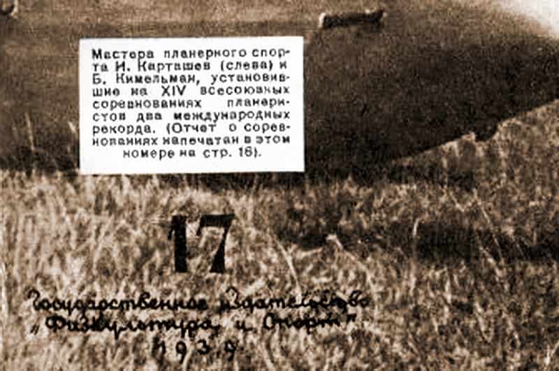 Мастер планерного спорта И. Карташев (слева) и Б. Камельман, установившие на XIV всесоюзных соревнованиях планеристов два международных рекорда (журнал «Физкультура и спорт» 1939 год, №17)