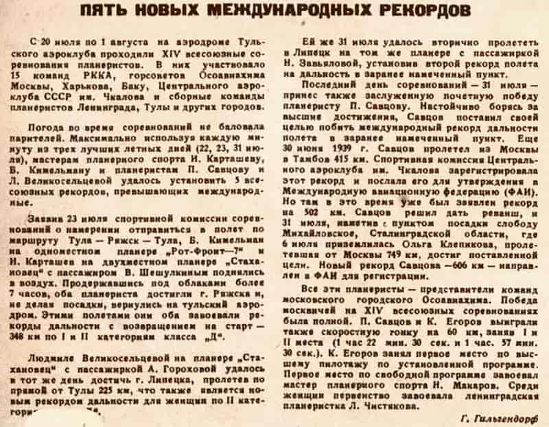 Ну а рекордный полёт был оформлен по всем правилам. В Москву были отправлена барограмма с автоматическими записями высоты и времени полёта, акт об отцепке, подписанный спортивным комиссаром Центрального аэроклуба СССР Рябчинским, и акт о посадке, подписанный местными организациями Сталинградского края.