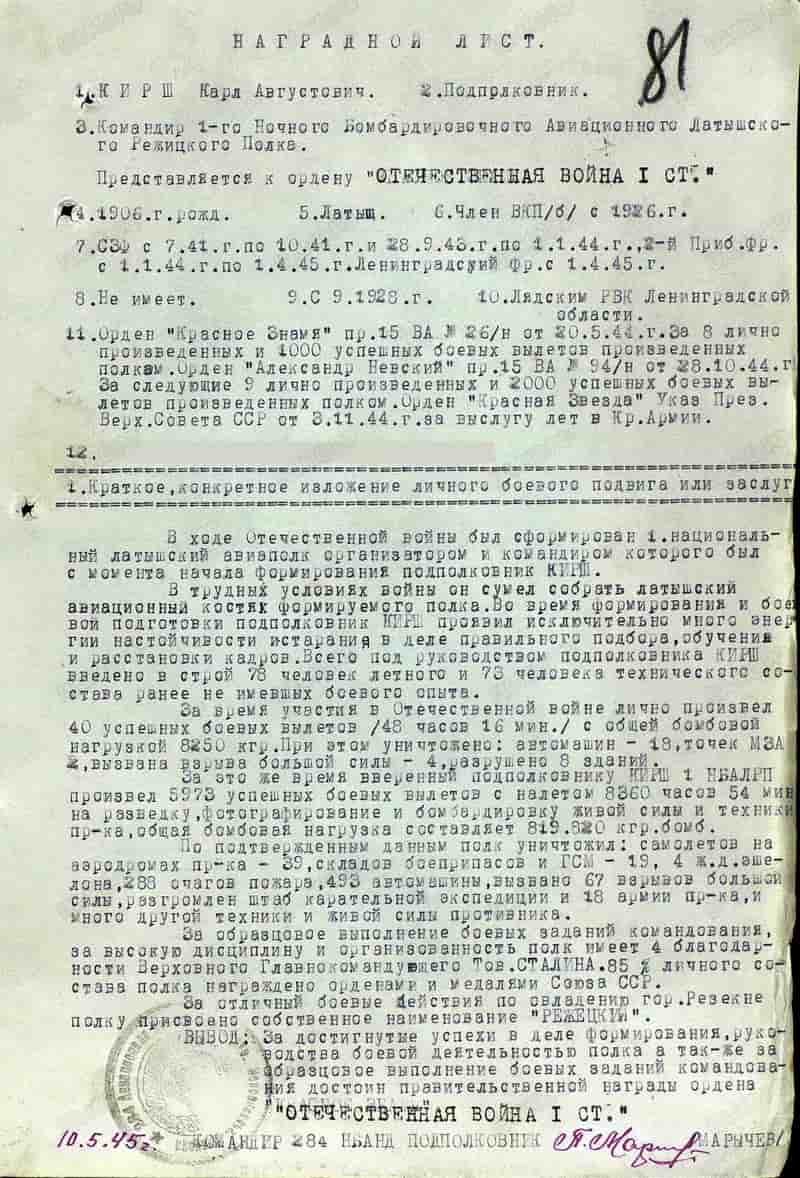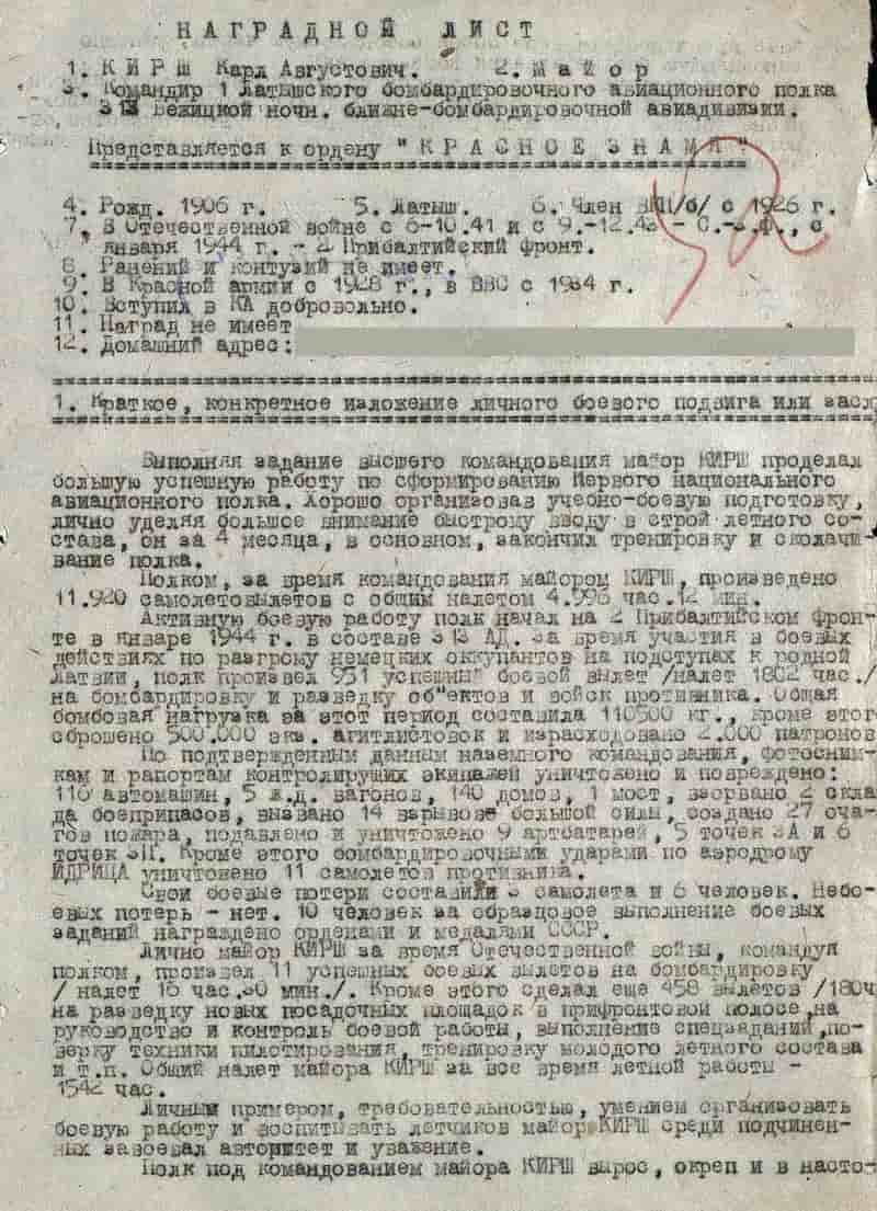 13.05.1944 командир 1-го Латышского ночного бомбардировочного авиаполка 313-й ночной ближне-бомбардировочной авиационной дивизии 15-й ВА 2-го Прибалтийского фронта майор Кирш К.А. представлен к награде и 20.05.1944 награждён орденом Красного Знамени.