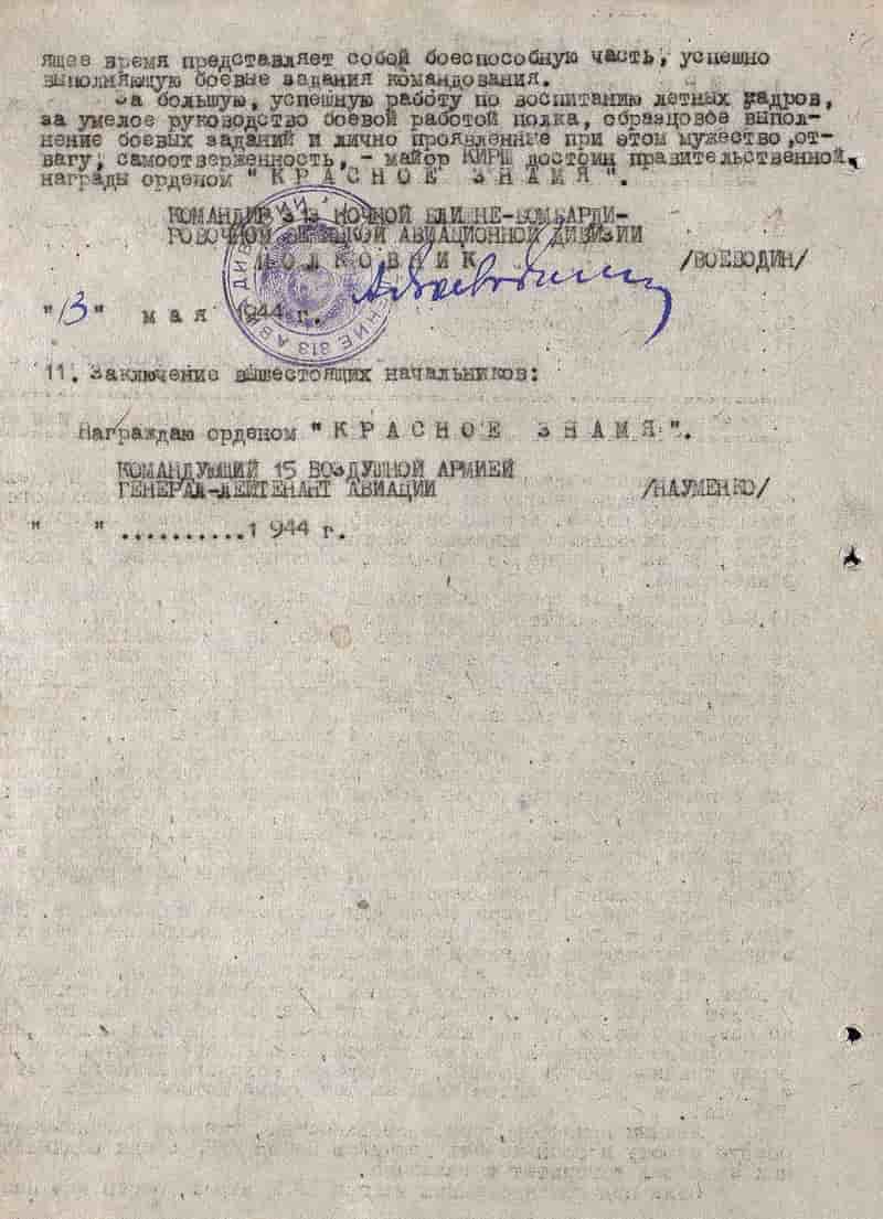10.05.1945 командир 1-го ночного бомбардировочного авиаполка 284-й ночной ближне-бомбардировочной авиационной дивизии 15-й ВА подполковник Кирш К.А. представлен к награде и 12.05.1945 награждён орденом Отечественной войны I степени.