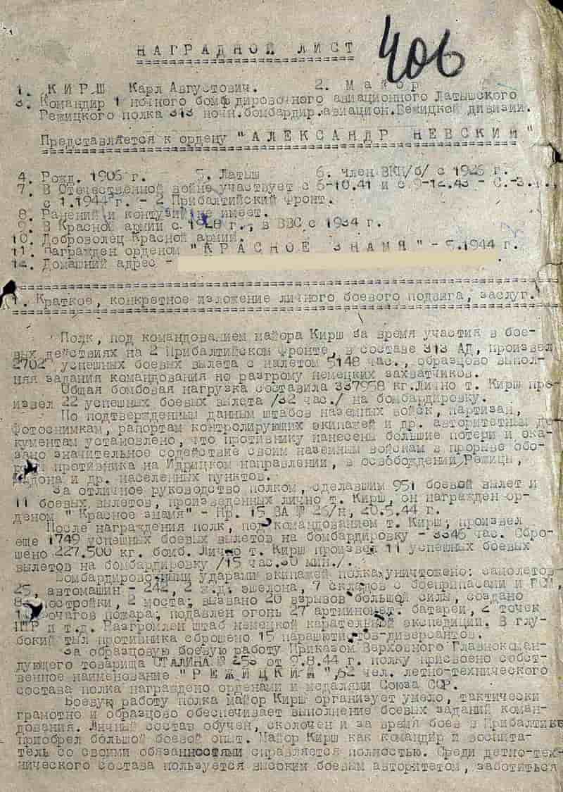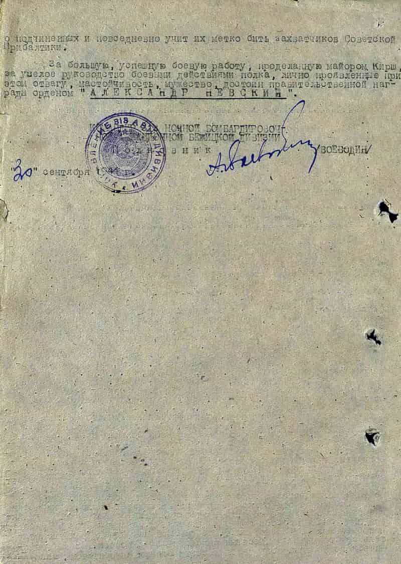 30.09.1944 командир 1-го ночного бомбардировочного авиаполка 313-й ночной ближне-бомбардировочной авиационной дивизии 15-й ВА 2-го Прибалтийского фронта майор Кирш К.А. представлен к награде и 28.10.1944 награждён орденом Александра Невского.