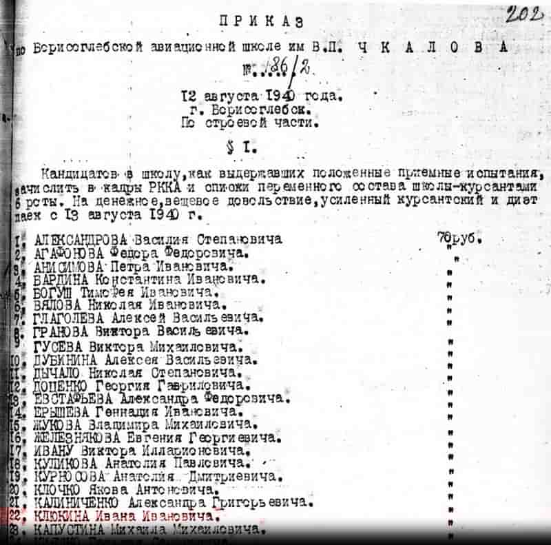 В рядах Красной армии с 12.08.1940, призван Борисоглебским РВК Ярославской области, зачислен в списки переменного состава курсантом 6-й роты Борисоглебской Краснознамённой военной авиационной школы им. В.П. Чкалова, поставлен на денежное (70 рублей), вещевое довольствие и усиленный курсантский паёк.