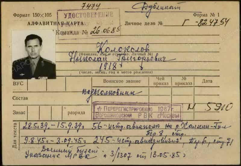 27.08.1945 инспектор-лётчик по технике пилотирования и теории полётов 245 иад 12-й ВА Забайкальского фронта капитан Колоколов Н.Г. представлен к награде и 28.08.1945 награждён орденом Отечественной войны II степени.