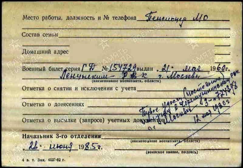 Состоял на учёте в Ленинском, Черёмшкинском и Ворошиловском РВК г. Москвы.