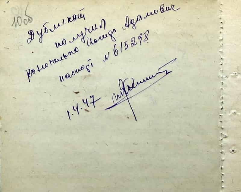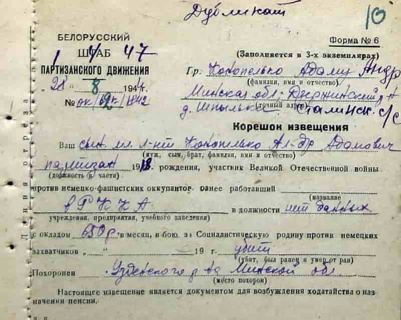 В извещении № ок/62к/1842 от 28.08.1944 Белорусского штаба партизанского движения, адресованном гражданину Конопелько Адаму Андреевичу в деревню Шпыльки Сталинского сельсовета Дзержинского района Минской области говорится следующее: