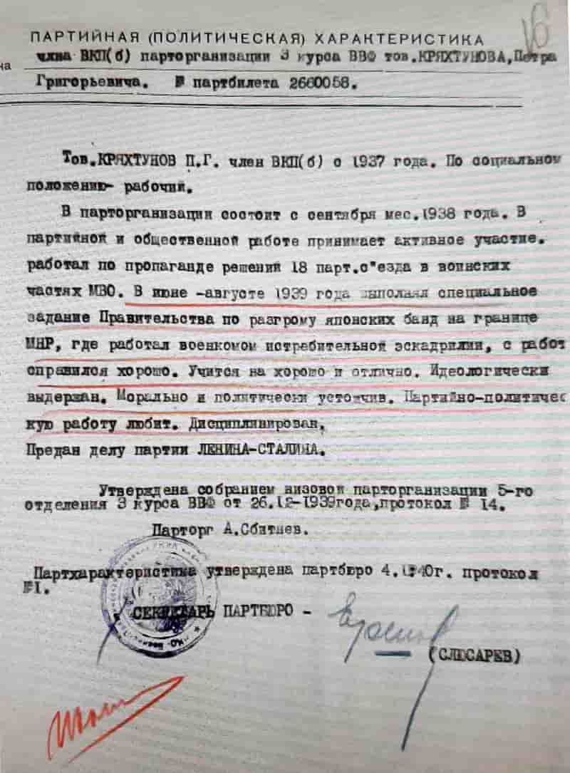 06.11.1937 года (2-й выпуск лётчиков-истребителей) лейтенант Кряхтунов П.Г. окончил 2-ю военную Краснознамённую школу лётчиков-истребителей ВВС РККА в г. Борисоглебске и назначен адъютантом 1-й эскадрильи 29-го истребительного авиационного полка ВВС особой Краснознаменной Дальневосточной армии (приказ НКО СССР № 01104/п).