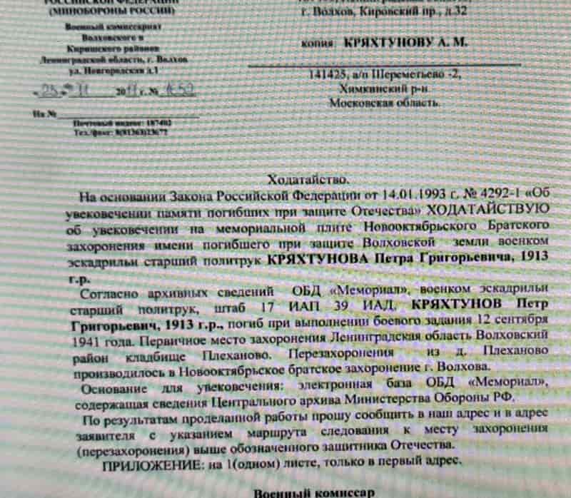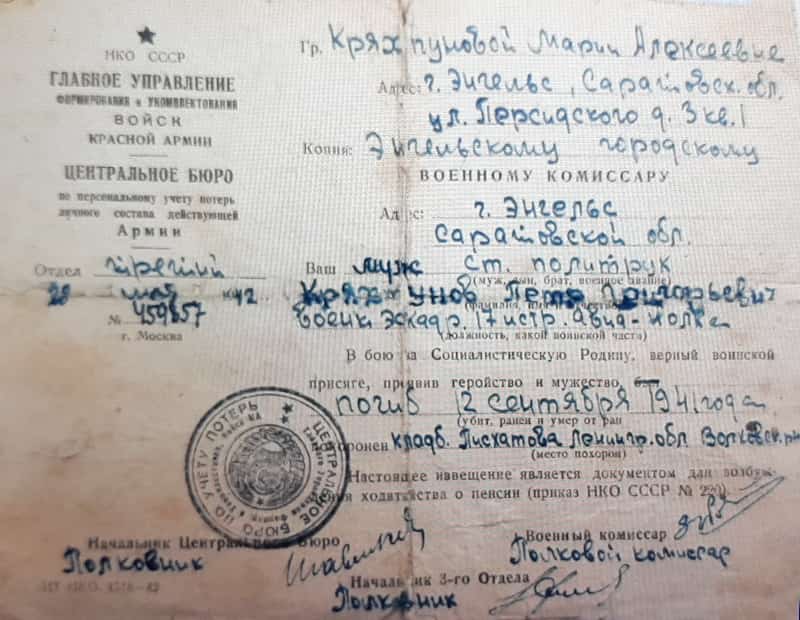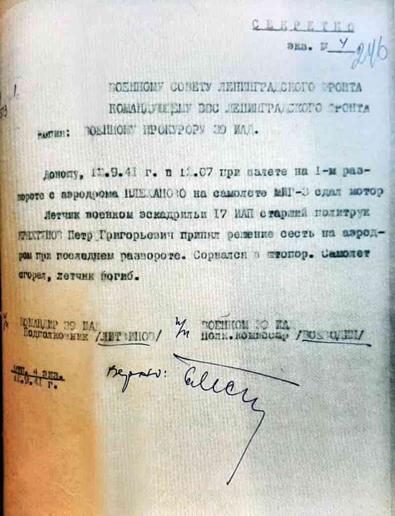 12 сентября 1941 года военный комиссар 17-го иап старший политрук Кряхтунов Пётр Григорьевич погиб при катастрофе самолёта МиГ-3.