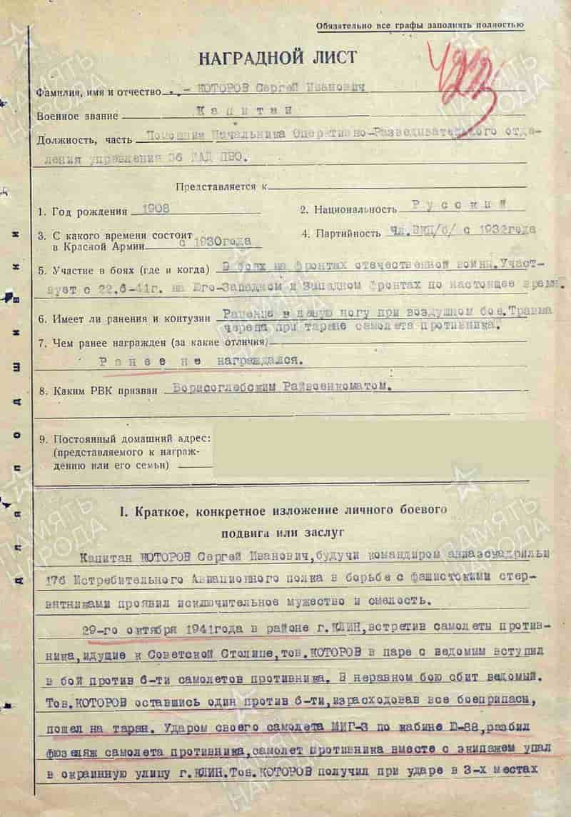 16.11.1942 помощник начальника оперативно-разведывательного отделения управления 36 иад ПВО капитан Которов С.И. представлен к награде и 14.02.1943 награждён орденом Красного Знамени.