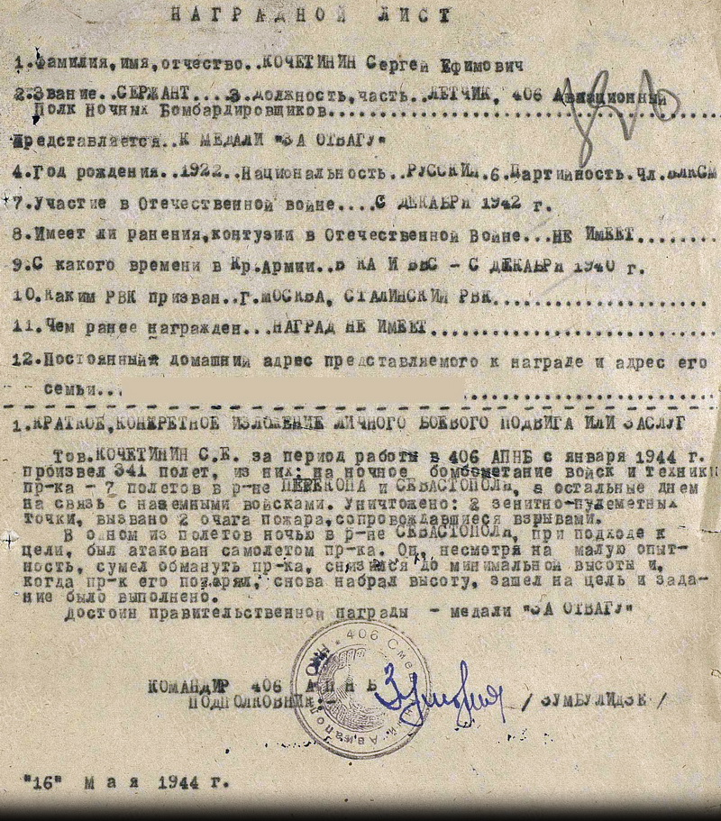 16.05.1944 лётчик 406-го нбап 2-й гвардейской армии 4-го Украинского фронта представлен к награде и 24.05.1944 награждён медалью «За отвагу».