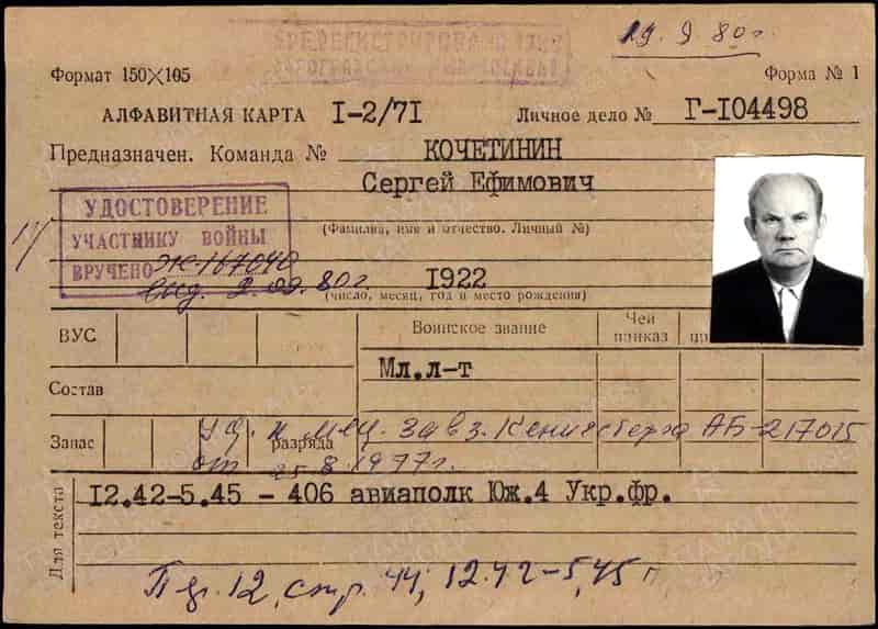 В 1945 году младший лейтенант Кочетинин Сергей Ефимович уволен в запас. Проживал в г. Москве.