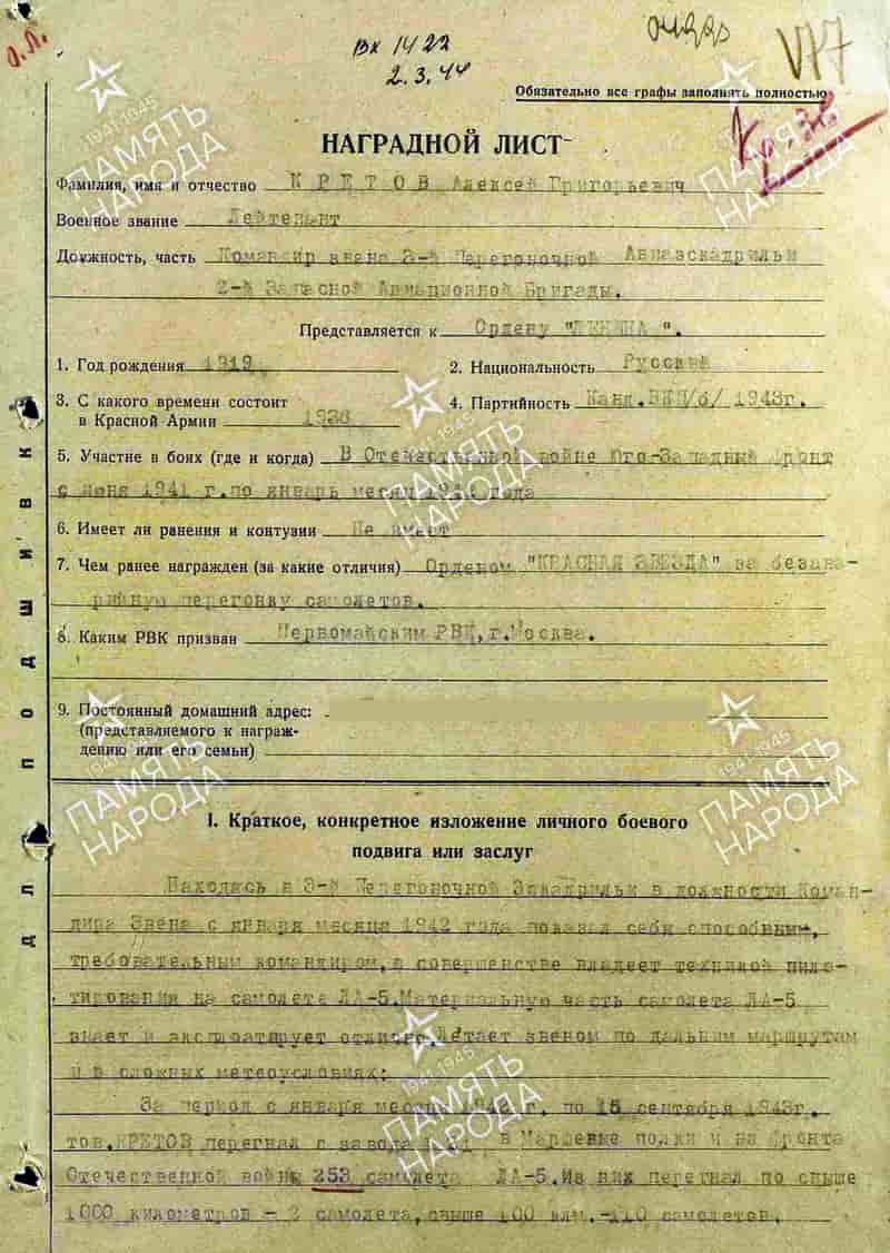 12.10.1943 командир звена 3-й перегоночной эскадрильи Кретов А.Г. представлен к награждению орденом Ленина. 28.02.1944 награждён орденом Красной Звезды.