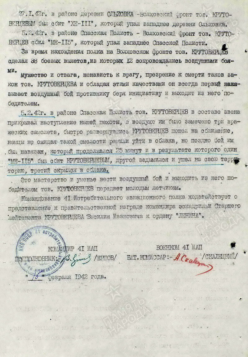 15.02.1942 командир эскадрильи 41 иап 2-й резервной авиационной группы 59-й армии Волховского фронта старший лейтенант Крутоверцев В.И. представлен к награде и 20.04.1942 награждён орденом Ленина.