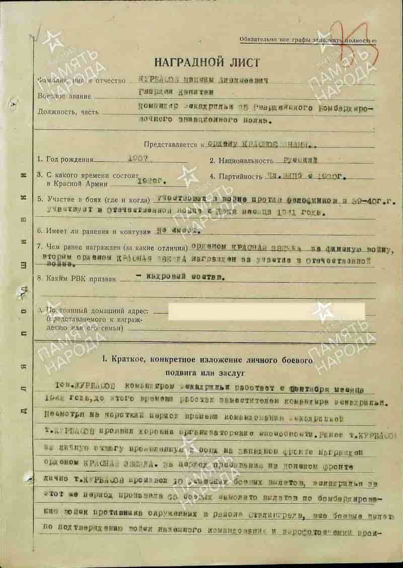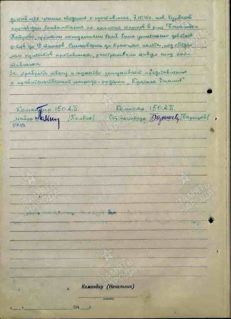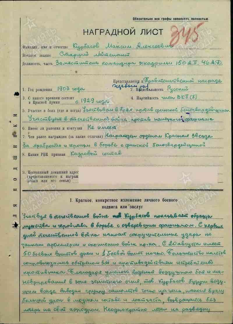 04.11.1941 заместитель командира эскадрильи 150-го сбап старший лейтенант Курбасов М.А. представлен к награждению орденом Красного Знамени. 30.11.1941 награждён орденом Красной Звезды.