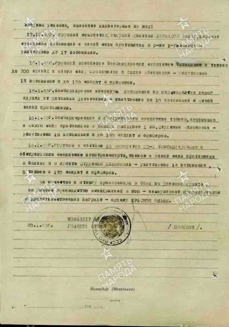 20.01.1943 командир 2-й эскадрильи 35 гвардейского бап 285 бад 2 бак гвардии капитан Курбасов М.А. представлен к награде и 28.01.1943 награждён орденом Красного Знамени.